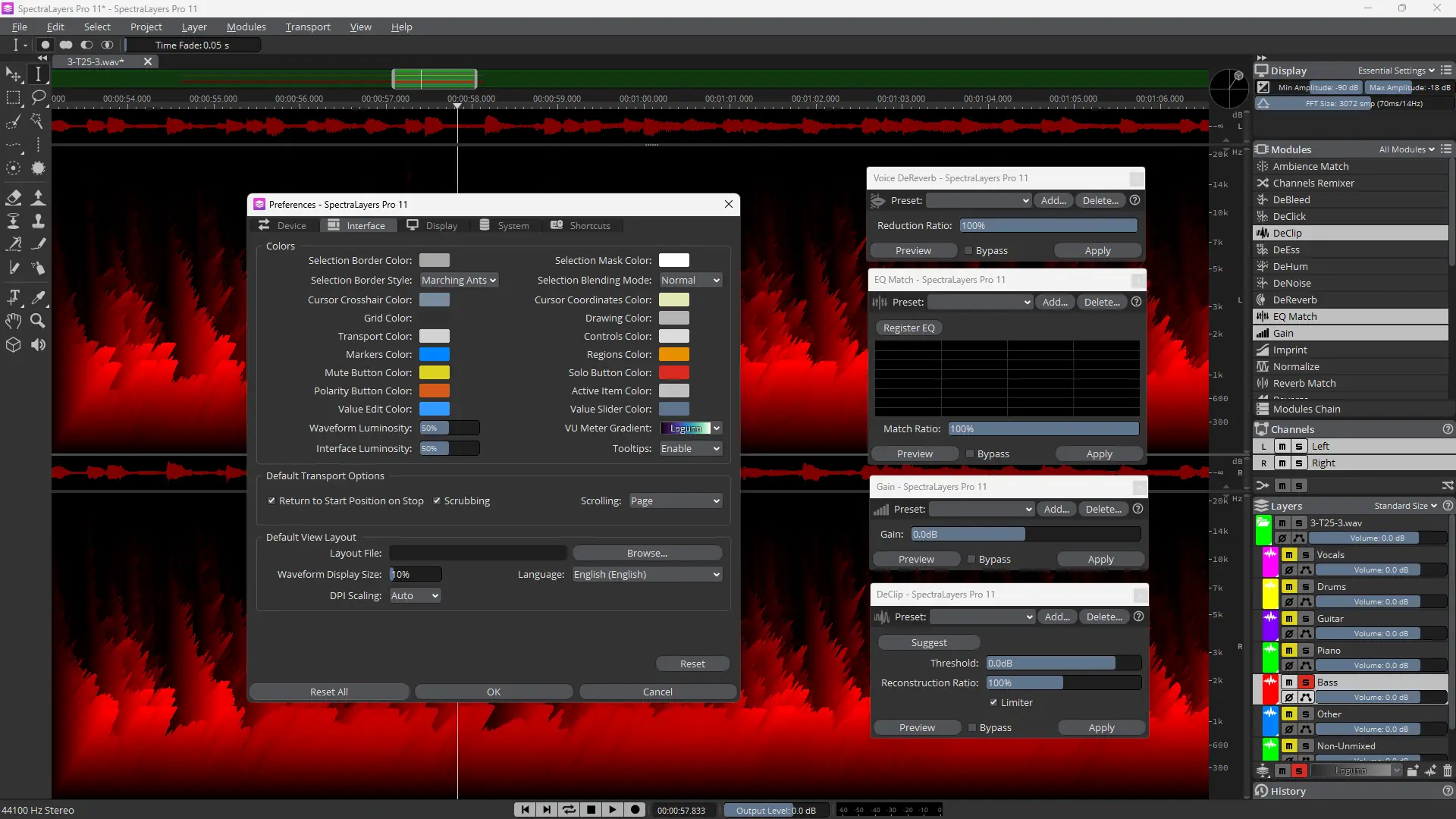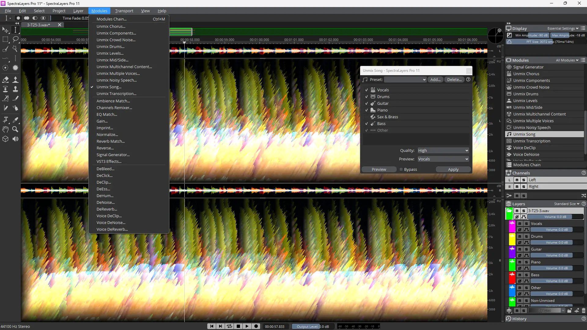 Использование SpectraLayers начинается с импорта аудиофайла, после чего он отображается в виде спектрограммы. Пользователь может выделять области интереса с помощью инструментов выделения, кистей или автоматических алгоритмов. Например, с помощью модуля Unmix Chorus можно отделить бэк-вокал от основного, что особенно полезно при ремастеринге или создании караоке-версий. Новый алгоритм Unmix Crowd Noise эффективно удаляет шум толпы с живых записей, оставляя чистое звучание выступления. Для восстановления перегруженных по уровню записей применяется функция Voice DeClip, основанная на нейросетях, которая анализирует и реконструирует обрезанные участки сигнала. Перетаскивание файлов в окно пакетной обработки ускоряет рабочий процесс, а возможность экспорта в виде отдельных слоёв или микса даёт гибкость при дальнейшем сведении. Инструмент Transfer Brush позволяет переносить звуковые элементы между слоями в реальном времени, а Transient Pencil — редактировать атаки ударных и других транзитных сигналов прямо на спектрограмме. Интерфейс программы был переработан: появился новый главный экран и компактные панели, что делает работу более удобной.
