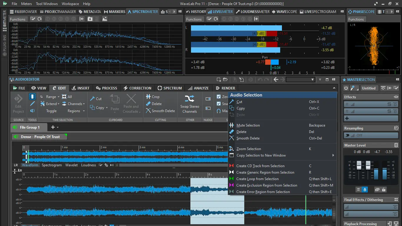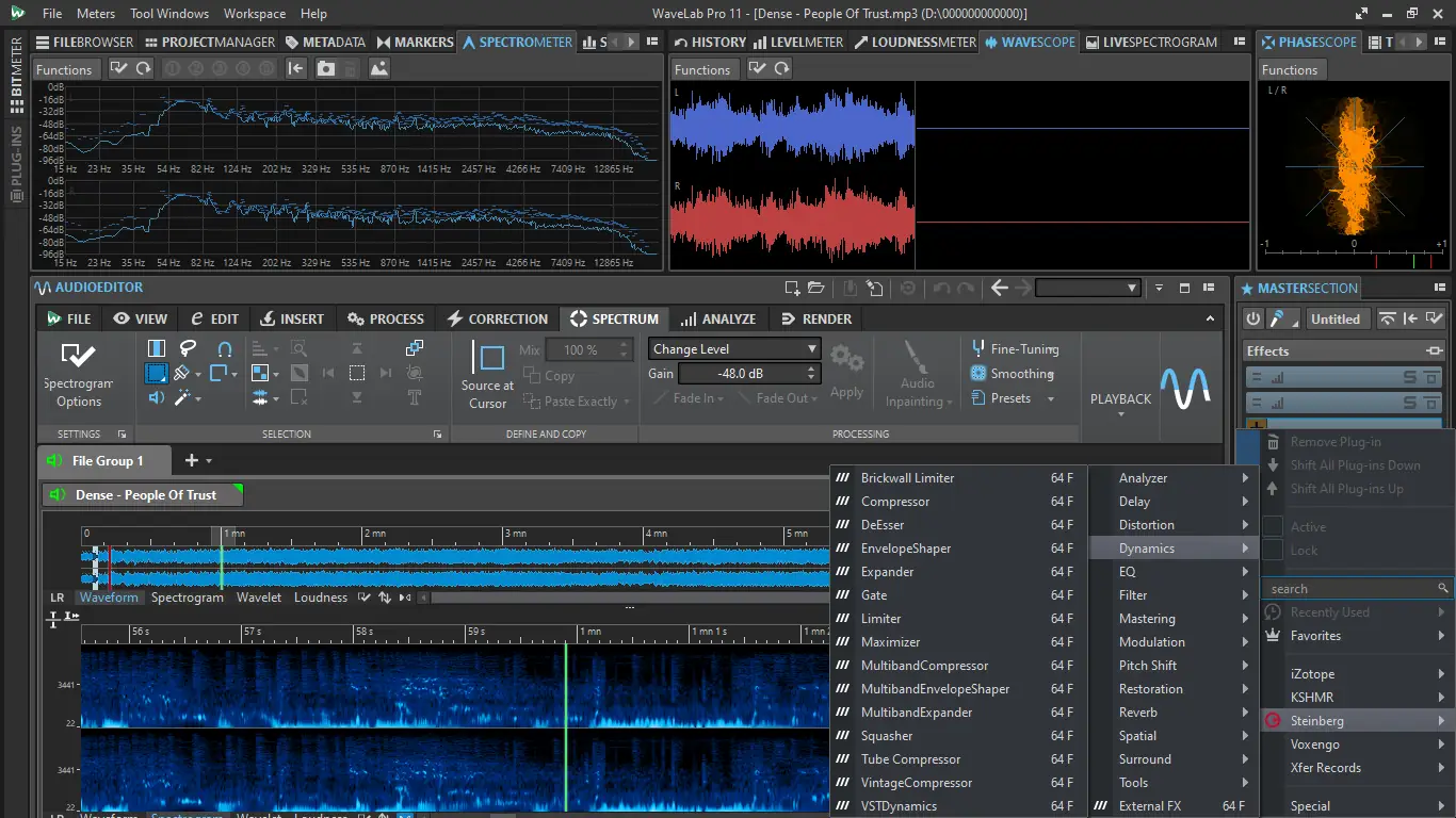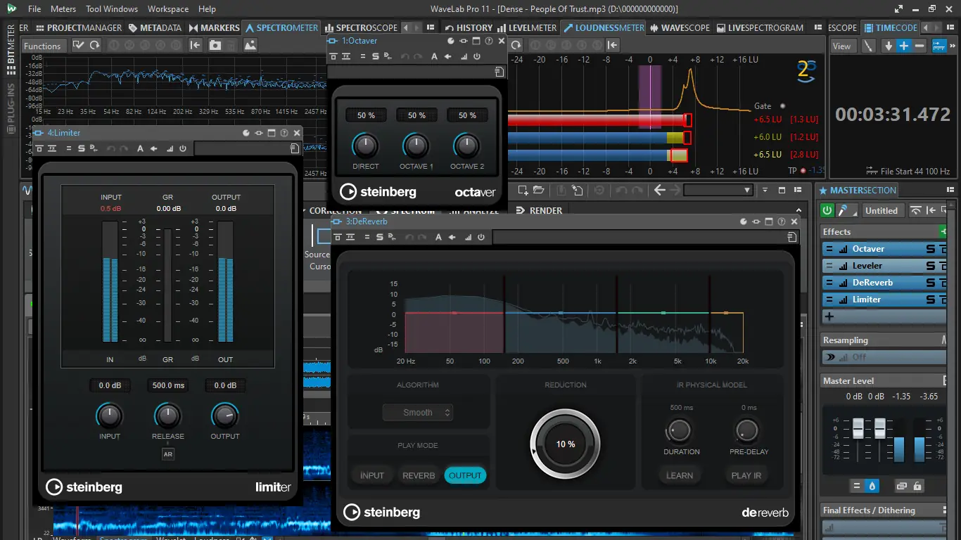Работа в WaveLab организована вокруг модульной структуры, где каждый этап обработки — от импорта до экспорта — выполняется в отдельной рабочей области. Пользователь может одновременно редактировать несколько аудиодорожек, применять коррекцию уровня, шумоподавление, эквализацию и динамическую обработку. Режим мастеринга включает в себя анализ спектра, корреляции и громкости, что критично для подготовки релизов. Программа поддерживает VST3-эффекты и инструменты, позволяя расширять возможности обработки. Пакетная конвертация помогает быстро транскодировать большие объёмы аудио в нужные форматы, сохраняя метаданные и структуру проектов.