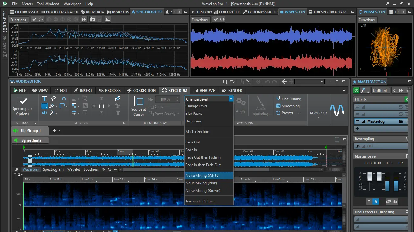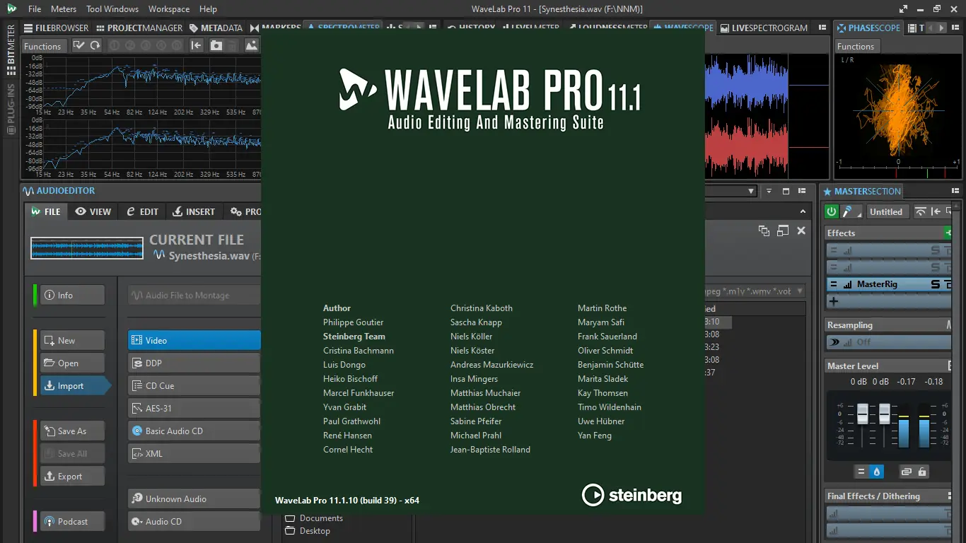 WaveLab — это комплексное программное обеспечение для профессионального аудиоредактирования и мастеринга, разработанное компанией Steinberg. Программа предлагает инструменты для точного анализа, обработки и финальной подготовки звуковых файлов высокого разрешения. Она активно используется в музыкальных студиях, радиовещании и кинопроизводстве благодаря своей стабильности и глубокой функциональности. Архитектура приложения оптимизирована под 64-битные системы, что позволяет обрабатывать большие объемы данных без потерь в производительности. Программа поддерживает частоты дискретизации до 384 кГц и работу с файлами практически неограниченного размера. Встроенные анализаторы, такие как SuperVision и Live Spectrogram, обеспечивают визуальный контроль над уровнем, фазой, громкостью и спектром сигнала.