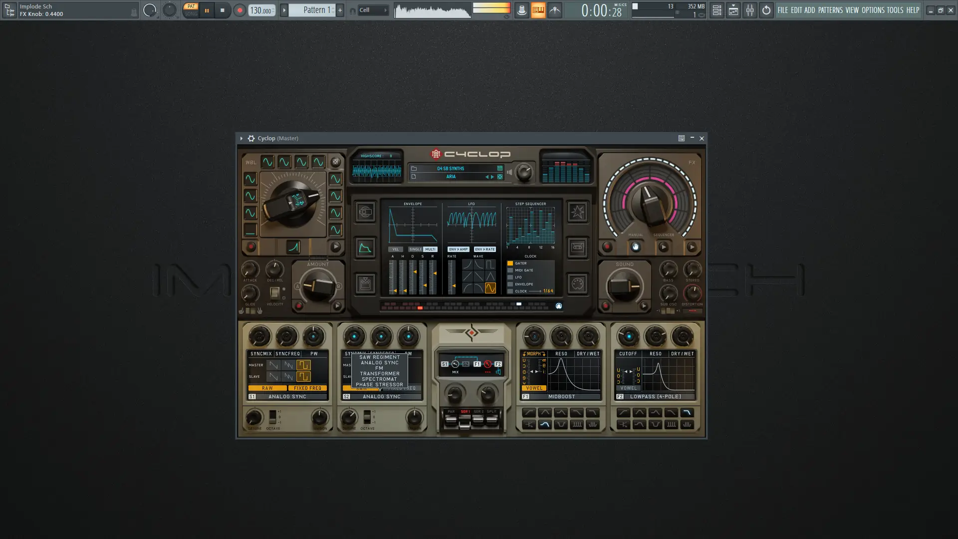 Cyclop — это басовый синтезатор, ориентированный на создание насыщенных, глубоких и ритмически насыщенных низких частот. Программа сочетает в себе спектральные, цифровые и аналоговые режимы звука, позволяя использовать собственные сэмплы в качестве волновых таблиц. Это мощный инструмент для электронной музыки, особенно в жанрах, где важны плотные басовые линии и сложная модуляция.