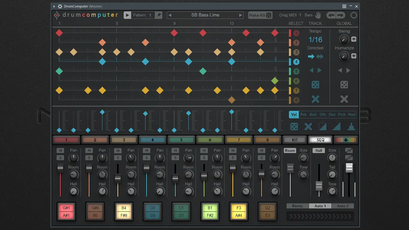 Работа с DrumComputer начинается с выбора или создания звукового движка, после чего можно настроить его тембр с помощью резонатора, wavetable и resynth-процесса. Секвенсор позволяет программировать ритмы с использованием функций случайной генерации, вероятностных срабатываний и ручной коррекции. Каждый шаг может быть модифицирован с помощью задержки, гуманизации или изменения громкости. Клавиатура паттернов обеспечивает быстрое переключение и запуск различных ритмических фраз.