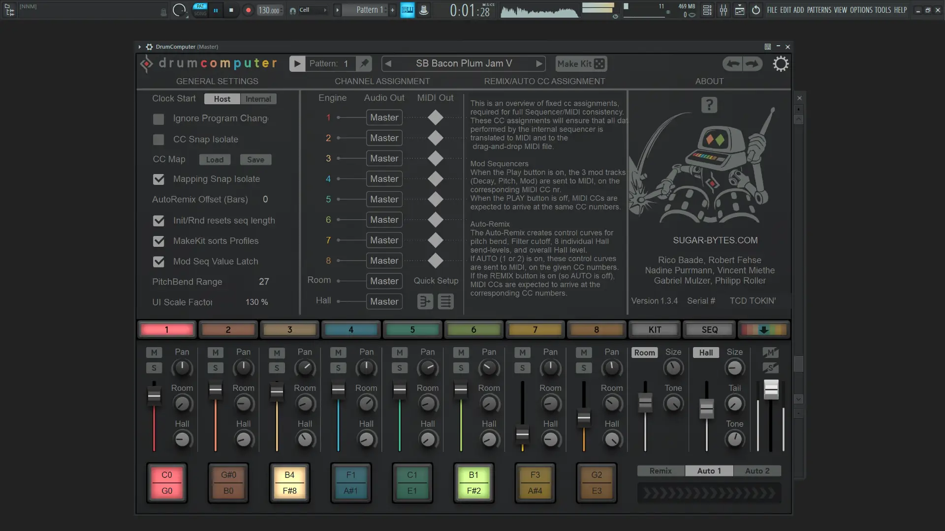 DrumComputer — это виртуальный инструмент, ориентированный на создание уникальных ударных звуков с использованием передовых технологий синтеза. Он объединяет в себе возможности синтезатора и драм-машины, позволяя генерировать как чистые электронные ударные, так и сложные текстурированные ритмы. Архитектура приложения построена вокруг восьми звуковых движков, каждый из которых оснащён резонатором, wavetable-генератором и функцией resynth, что открывает широкие горизонты для звукового дизайна.