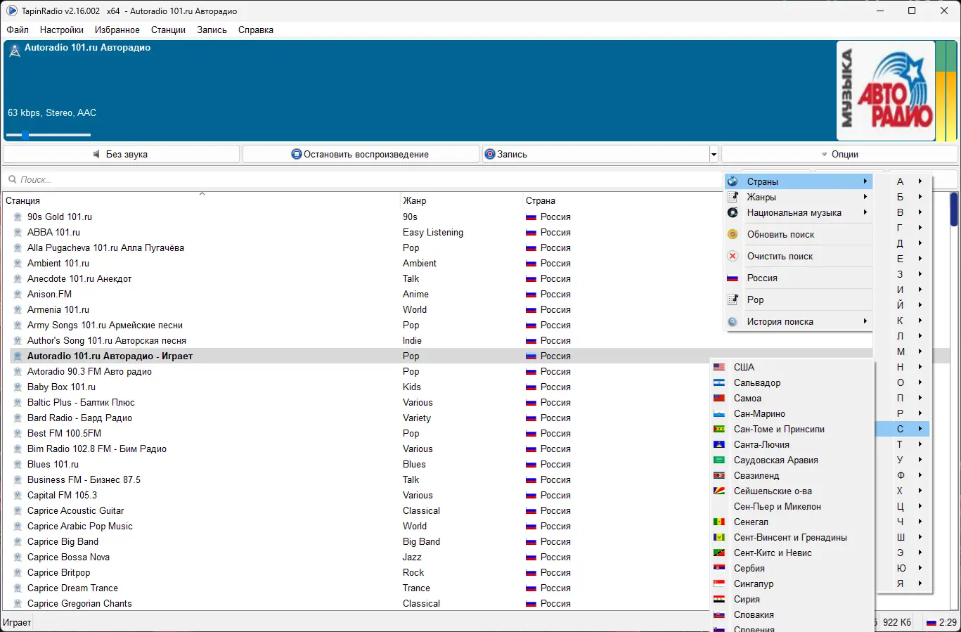 - Большое количество доступных радиостанций с регулярным обновлением базы.
