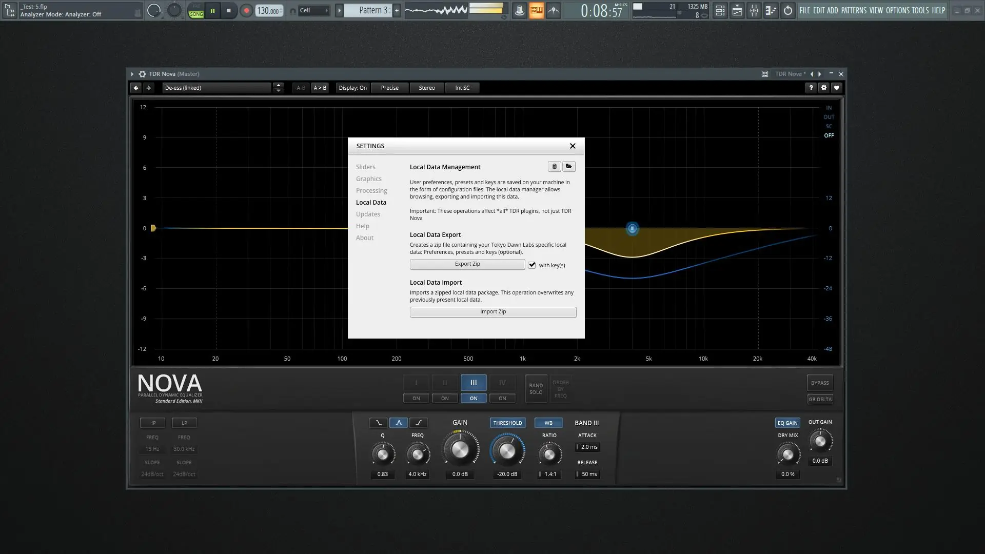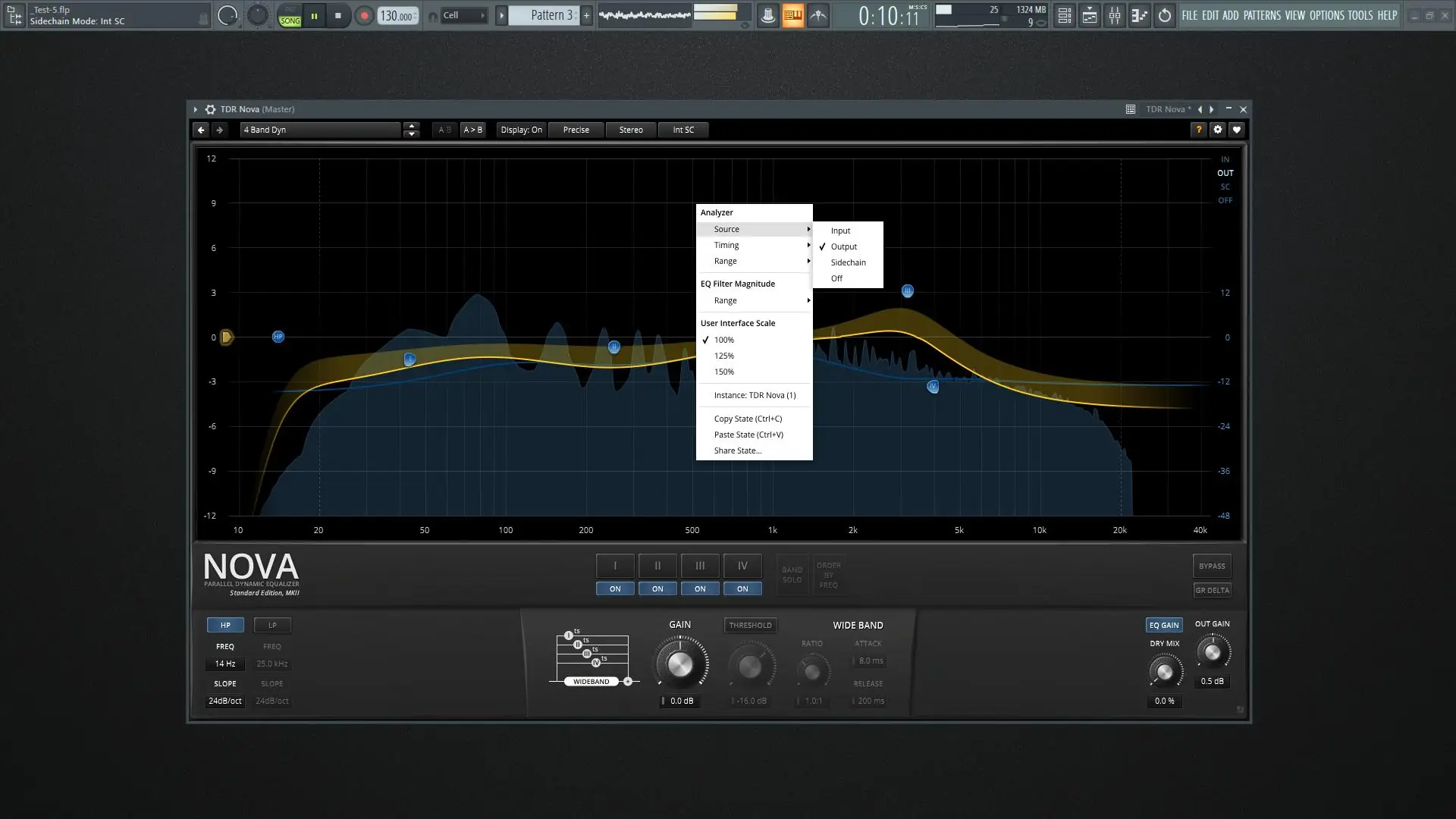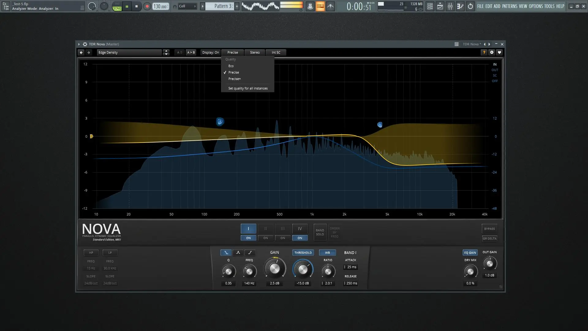 Использование TDR — Nova начинается с выбора полосы и настройки её частотного диапазона, добротности и типа фильтра. После этого активируется динамическая секция, где можно задать порог срабатывания, характер реакции и время атаки и релиза. Работа в режиме параллельного эквализации позволяет смешивать обработанный и необработанный сигнал, добиваясь естественного звучания. Графический анализатор отображает спектр в реальном времени, а функция равной громкости помогает сравнивать настройки без влияния уровня сигнала. Благодаря поддержке внешнего сайдчейна, возможна сложная синхронная обработка, например, дебитизация вокала по стороннему источнику.