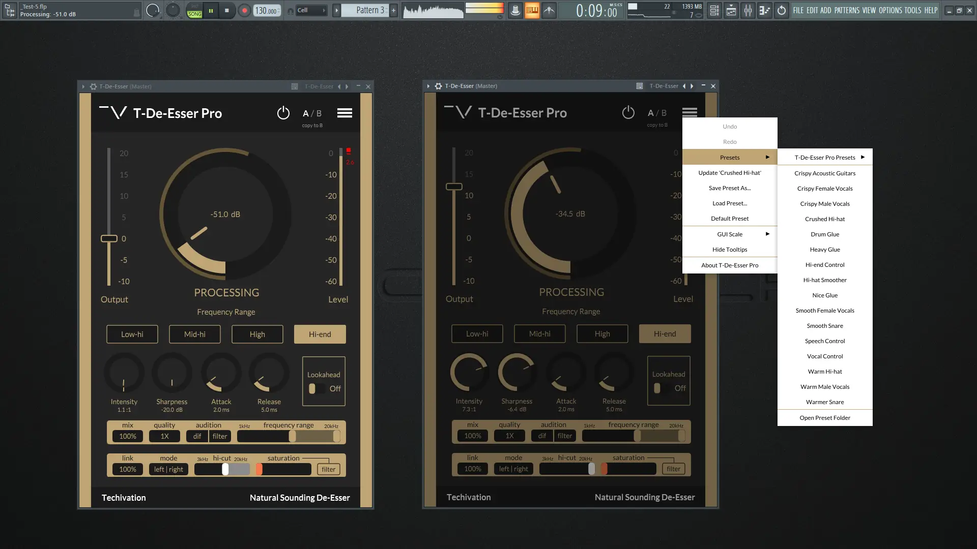 - T-De-Esser Pro эффективно подавляет шипящие звуки, не затрагивая общую ясность вокала