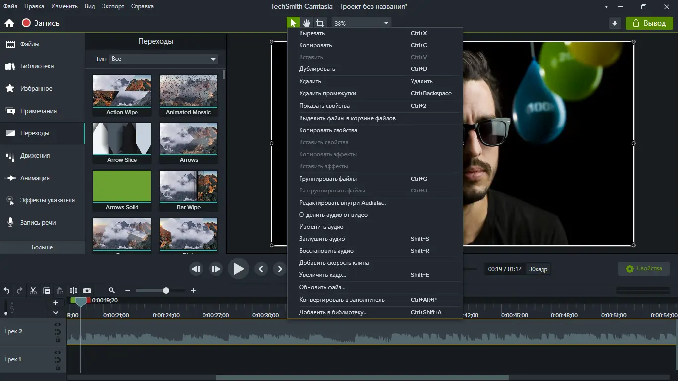 - Редактирование аудиодорожек, включая шумоподавление и регулировку громкости