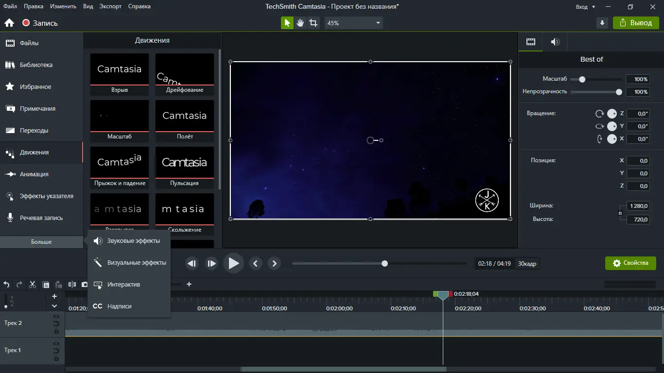TechSmith Camtasia — это мощный инструмент для записи экрана и профессионального видеомонтажа, сочетающий в себе функции захвата видео, редактирования и публикации контента. Программа подходит как для новичков, так и для опытных пользователей, позволяя создавать обучающие ролики, презентации, демонстрации программ и другие материалы с высоким качеством изображения и звука.