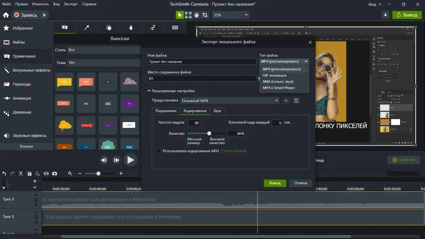 TechSmith Camtasia предлагает широкий функционал, но, как и любое ПО, имеет свои плюсы и минусы. Программа демонстрирует высокую производительность при работе с большими проектами и поддерживает современные стандарты кодирования. Удобный интерфейс позволяет быстро освоить базовые операции, а наличие шаблонов и эффектов ускоряет процесс создания видео. Однако при интенсивной работе могут возникать нагрузки на систему, особенно на слабых конфигурациях.