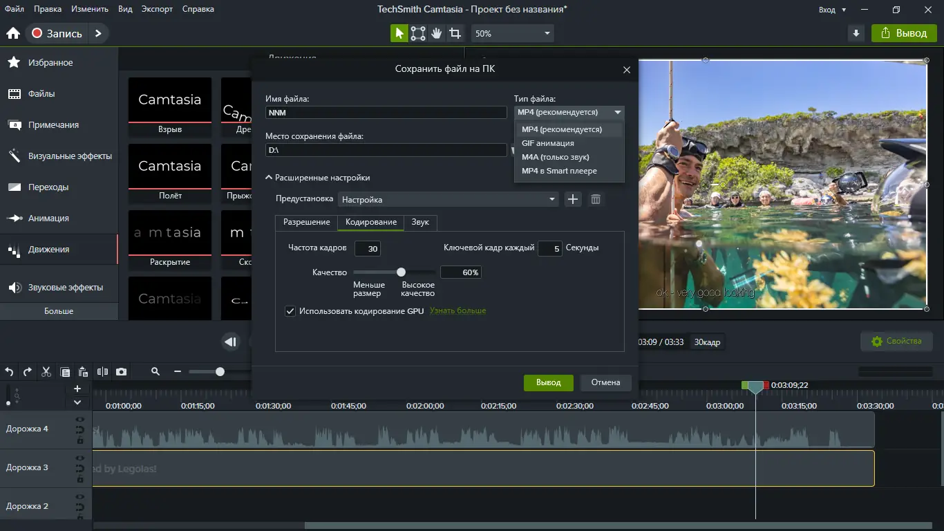 Программа TechSmith Camtasia обеспечивает высокоточную запись действий на экране с возможностью одновременного захвата веб-камеры, микрофона и системных звуков. Это делает её идеальным решением для создания обучающих видео, обзоров программного обеспечения и материалов для дистанционного обучения. Поддержка множества форматов вывода, включая AVI, MP4, MOV, WMV, GIF и специализированный CAMV, позволяет адаптировать контент под любые платформы и задачи. Особое внимание уделено качеству сжатия, что обеспечивает минимальный размер файла без потери чёткости изображения.