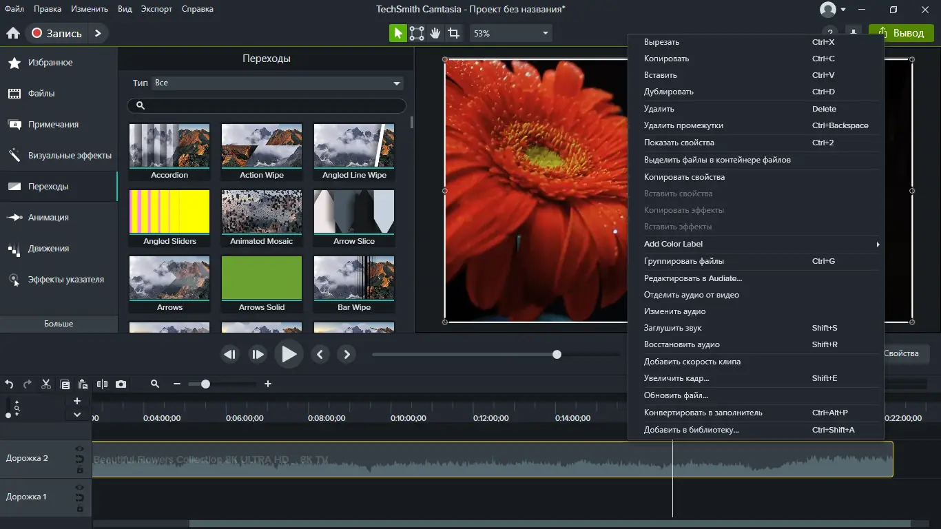 Camtasia объединяет функции захвата и видеоредактора в единой среде, упрощая процесс создания профессиональных материалов без необходимости использовать дополнительные программы.