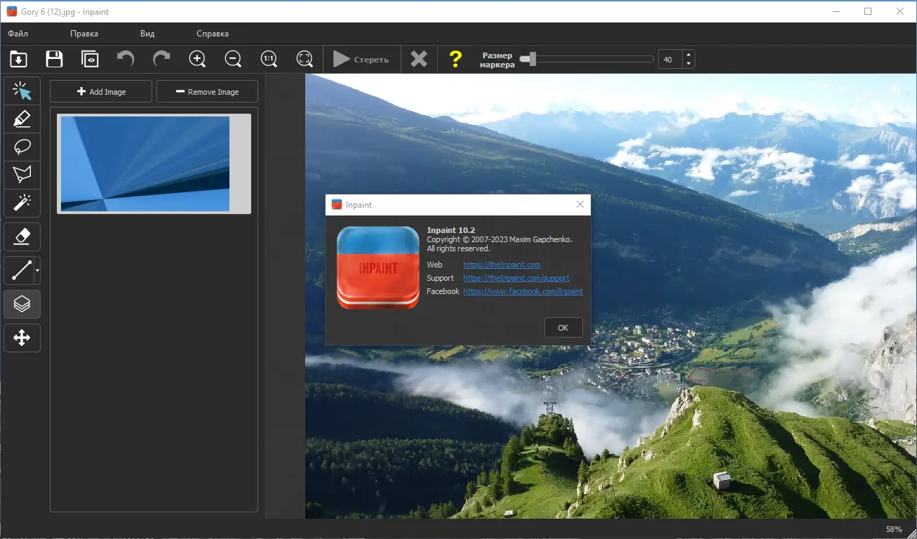 Teorex Inpaint — это инструмент для точного удаления нежелательных элементов с изображений с автоматическим восстановлением фона. Программа подходит для редактирования фотографий без необходимости глубоких познаний в графических редакторах.