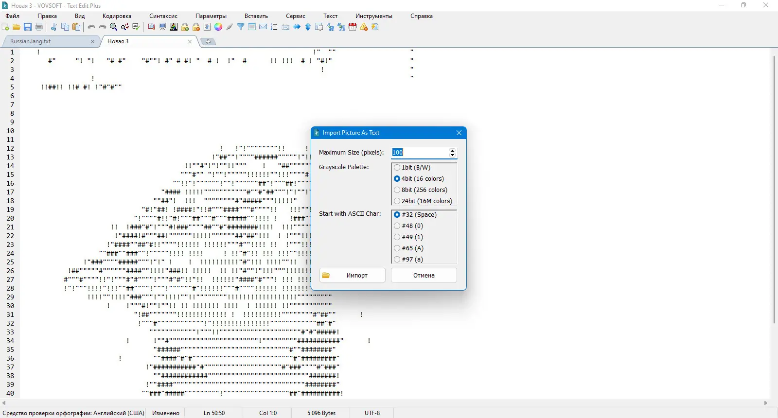 - Возможность импорта изображений в виде ASCII-графики