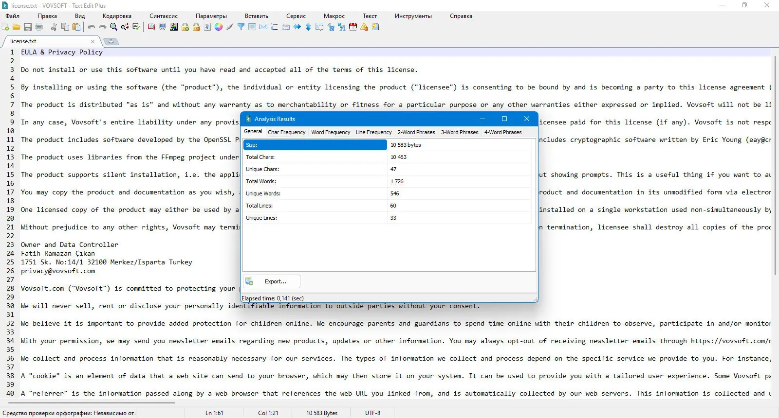- Встроенный модуль анализа текста выводит статистику: количество слов, символов, строк и частоту употребления терминов.