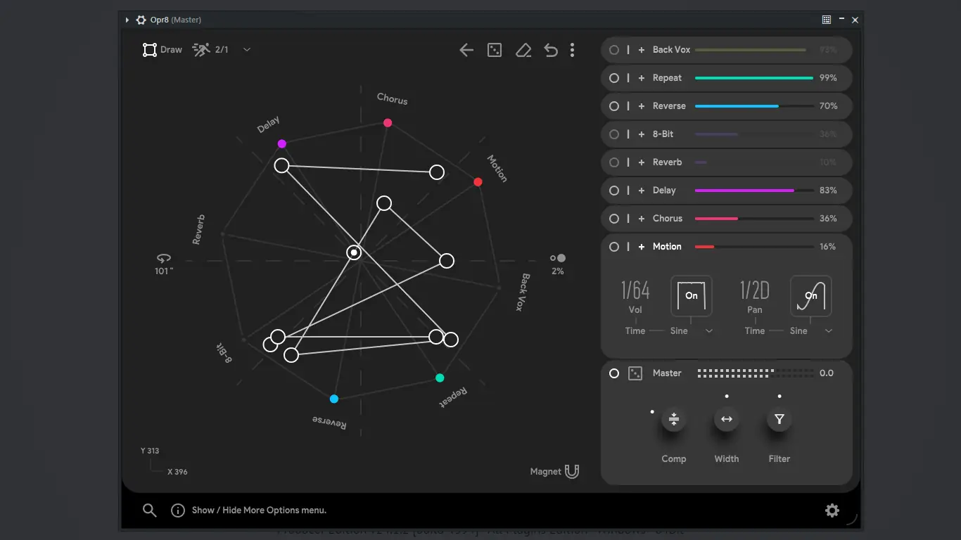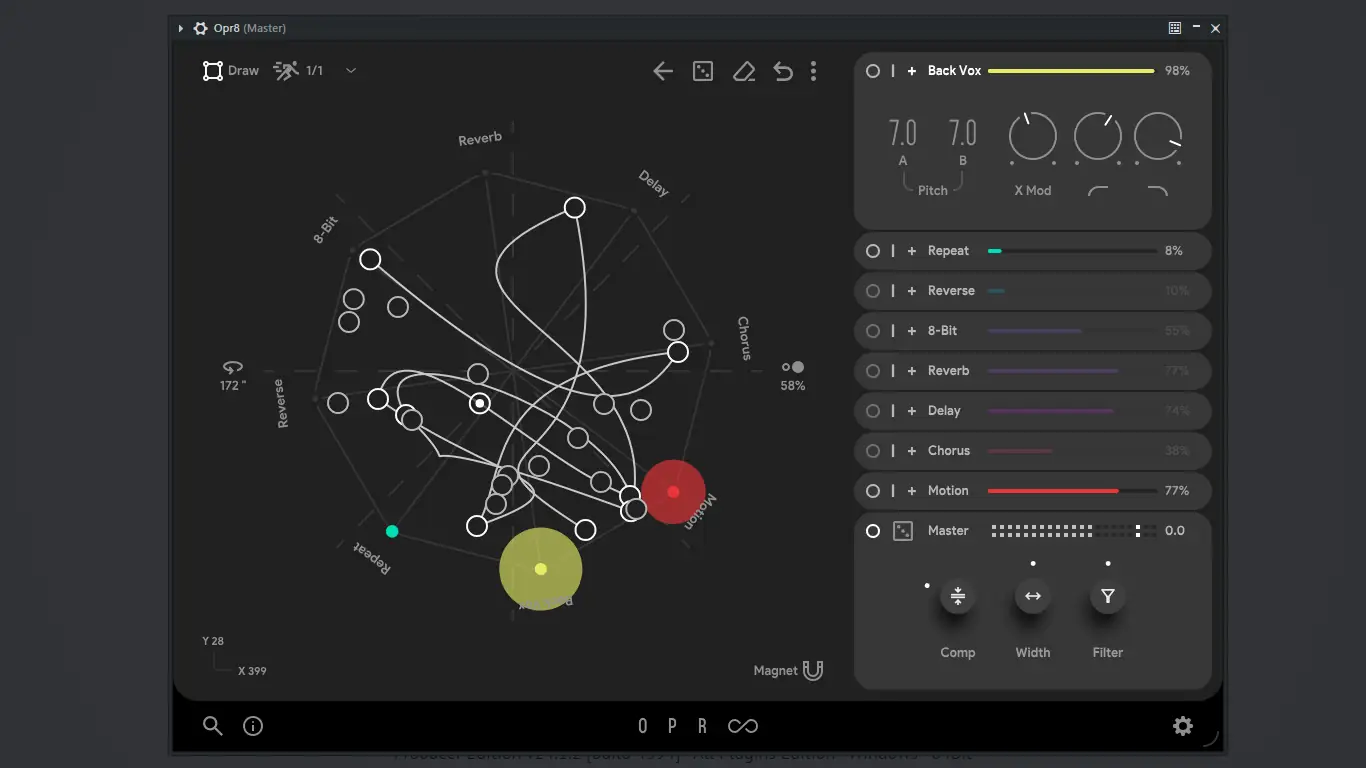 Использование Thenatan начинается с загрузки плагина в DAW. После этого пользователь может активировать нужные эффекты через центральный интерфейс, комбинируя их по своему усмотрению. Особое внимание стоит уделить Polygon Pad — с его помощью можно рисовать кривые автоматизации, задавать ритмичные изменения параметров и экспериментировать с динамикой звука. Такие элементы, как Magnet Slider, помогают привязывать изменения к сетке, а Randomizer вносит непредсказуемость, что особенно полезно при создании экспериментальной музыки. Skew Knob позволяет ассиметрично смещать форму сигнала, добавляя характерный оттенок. Режим 8-Bit имитирует звучание старых игровых приставок, а функция Reverb даёт возможность моделировать пространства от небольшой комнаты до огромного зала. Работа с вокалом упрощается благодаря эффекту Backvox, который автоматически генерирует фоновые дубли с задержкой и затуханием. Для создания насыщенных битов подойдёт режим Motion, придающий движение статичным паттернам. Программа поддерживает работу с внешними MIDI-контроллерами, что делает процесс живым и интерактивным.