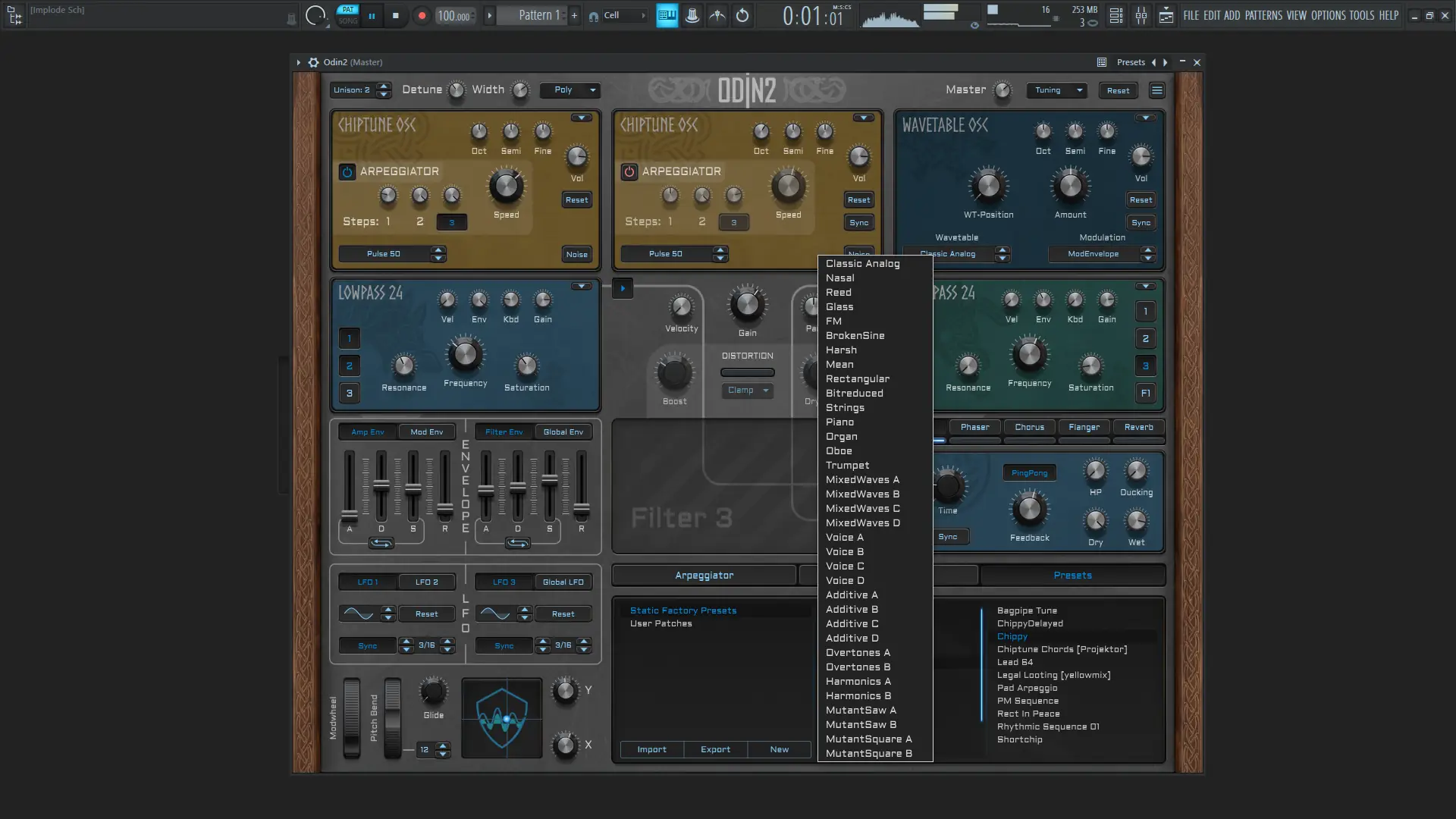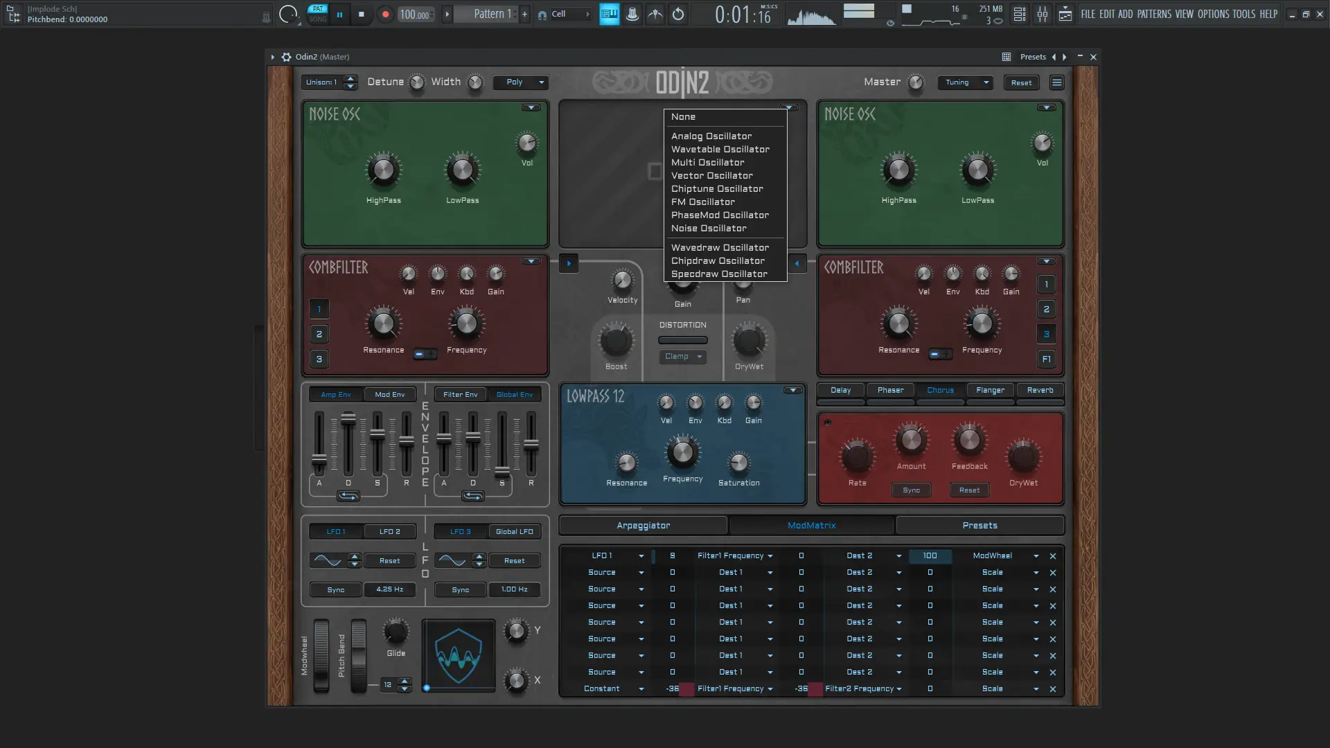Модуляция реализована через матрицу, где легко задать источники и цели воздействия, включая LFO, огибающие и XY-контроллер. Арпеджиатор позволяет быстро генерировать мелодические последовательности, а встроенные эффекты дают возможность обрабатывать звук без подключения внешних плагинов. Поддержка микронастройки через файлы .kbm и .scl позволяет использовать нестандартные строи и музыкальные системы, что особенно ценно для экспериментальной музыки.