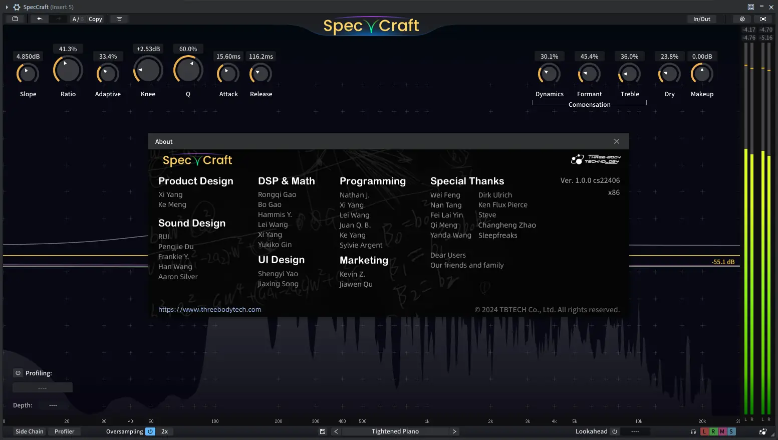 Three Body Tech — SpecCraft представляет собой многофункциональный аудиопроцессор, ориентированный на профессиональное микширование и мастеринг. Он сочетает в себе возможности динамического эквалайзера, подавителя резонансов и спектрального компрессора, обеспечивая высокую точность обработки без вмешательства в естественную динамику сигнала. Основной задачей инструмента является выявление и коррекция проблемных частот, которые могут искажать восприятие микса.