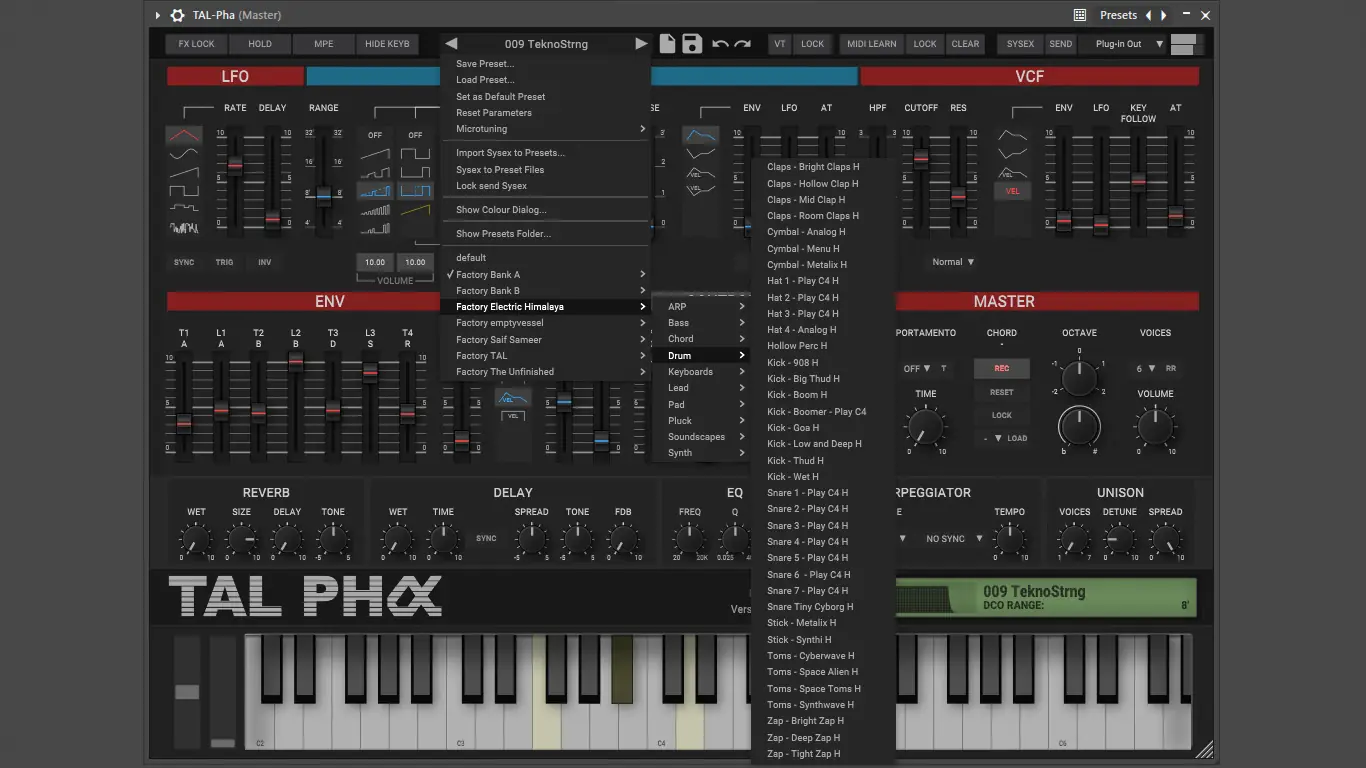 Использование TAL-Pha в проекте начинается с загрузки плагина в DAW через форматы VST, AU или других поддерживаемых интерфейсов. Интерфейс программы интуитивно понятен и организован в соответствии с логикой оригинального аппарата, но с добавлением современных элементов управления. Пользователь может загружать пресеты, редактировать параметры осцилляторов, фильтров и огибающих, а также активировать встроенные эффекты. Поддержка MPE и Aftertouch позволяет использовать контроллеры с чувствительностью к нажатию и давлению, что особенно полезно при живом исполнении. Функция импорта Sysex-файлов даёт возможность переносить патчи с физических устройств, а также управлять ими напрямую из плагина при наличии соответствующей поддержки в DAW.