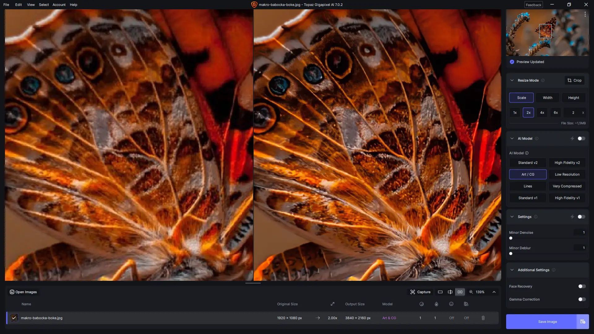 Интерфейс программы интуитивно понятен: достаточно загрузить изображение, выбрать коэффициент увеличения и нужную модель обработки. Для портретов активируется режим Face Recovery AI, для архитектуры — специальная модель «Lines», а для сильно сжатых файлов — «Very Compressed». После настройки параметров запускается процесс апскейлинга, который занимает несколько минут в зависимости от размера изображения и мощности системы. Результат можно сравнить с оригиналом в режиме до/после. Обработанные файлы сохраняются в популярных форматах, включая TIFF, PNG и JPEG, с сохранением метаданных.