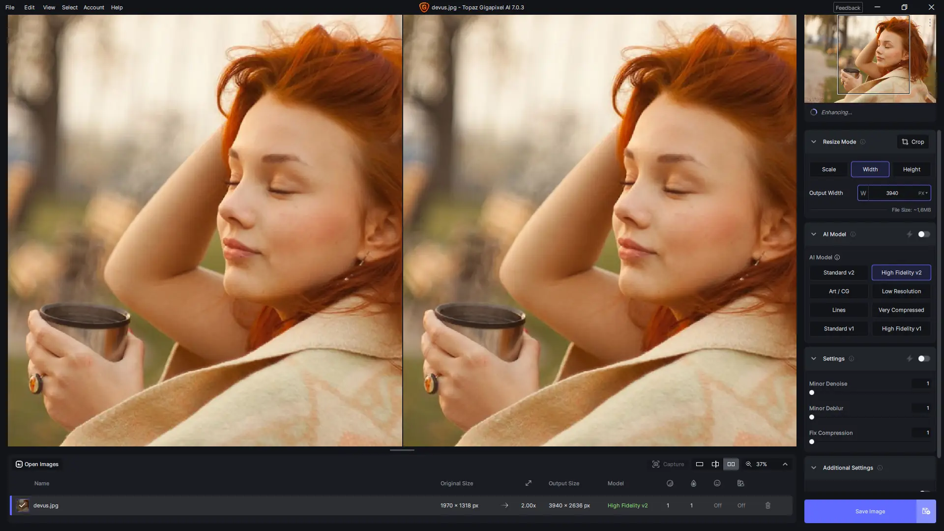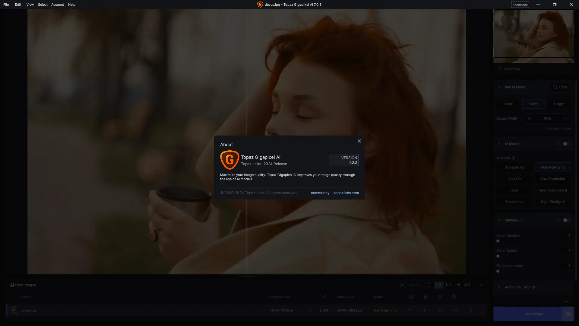 Интерфейс программы прост и интуитивно понятен. Пользователь загружает изображение, выбирает коэффициент увеличения — от 100% до 600% — и активирует нужную модель обработки. Доступны пресеты для портретов, пейзажей, архитектуры и сжатых изображений. После обработки можно сравнить оригинал и результат в режиме до/после, что помогает оценить качество улучшения. Программа поддерживает пакетную обработку, что особенно полезно при работе с большим количеством файлов. Экспорт производится в популярные форматы, включая TIFF, PNG и JPEG, с настройкой качества и DPI. Версия 7 демонстрирует высокую скорость и оптимизацию памяти, что делает её пригодной для использования даже на средних конфигурациях.