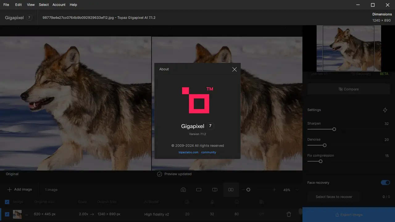Topaz Gigapixel AI — это программное обеспечение на базе искусственного интеллекта, предназначенное для увеличения разрешения изображений с сохранением и восстановлением мельчайших деталей. Благодаря передовым алгоритмам глубокого обучения, приложение способно превращать низкокачественные снимки в четкие высокодетальные изображения, устраняя артефакты и добавляя естественные текстуры. Решение подходит как для профессиональных фотографов, так и для любителей, стремящихся улучшить качество своих работ.