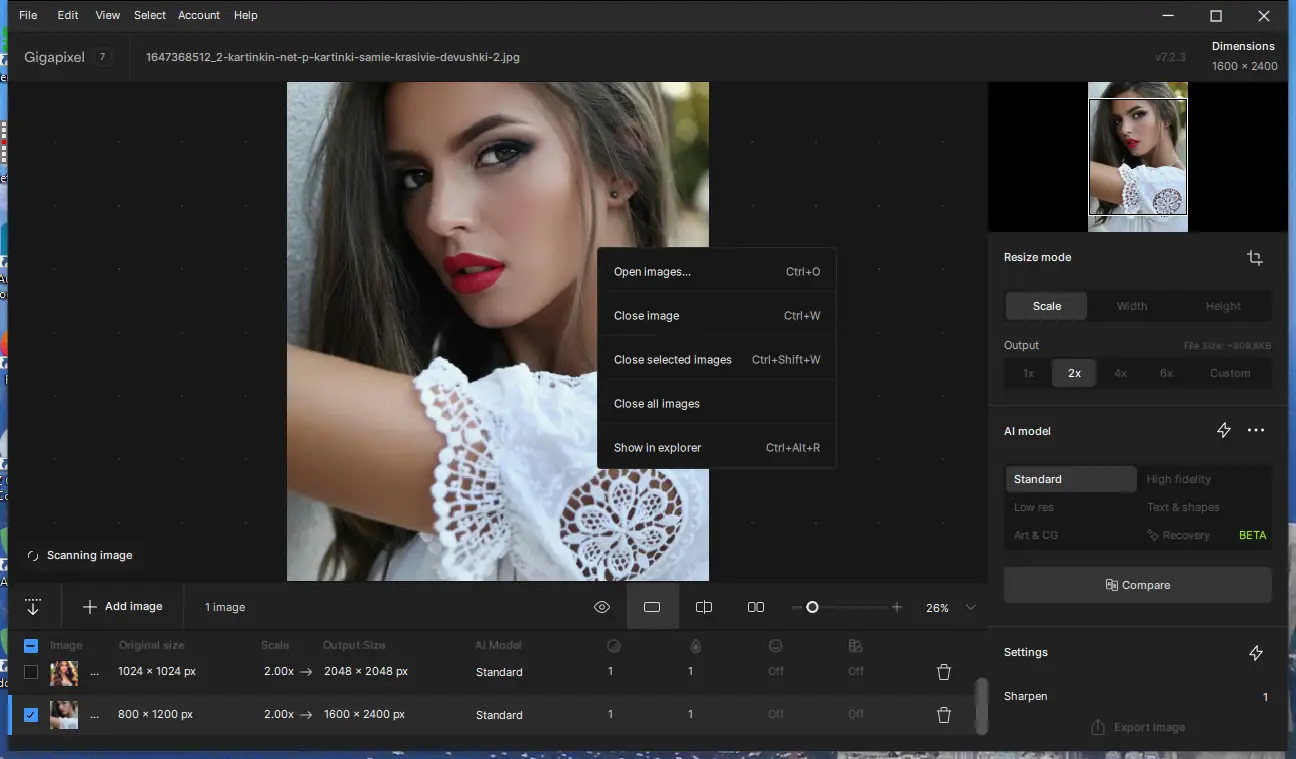 Работа с приложением интуитивно понятна. Достаточно открыть изображение через меню FileOpen Images, выбрать нужный коэффициент масштабирования и запустить процесс. Программа предлагает несколько режимов обработки — для портретов, артефактов, текста или общего назначения. После предварительного просмотра результатов можно сохранить итоговое изображение в желаемом формате. Интерфейс минималистичен, но функционален, а встроенные подсказки помогают новичкам быстро освоиться. Обработка происходит на видеокарте, что обеспечивает высокую скорость даже при работе с большими файлами.