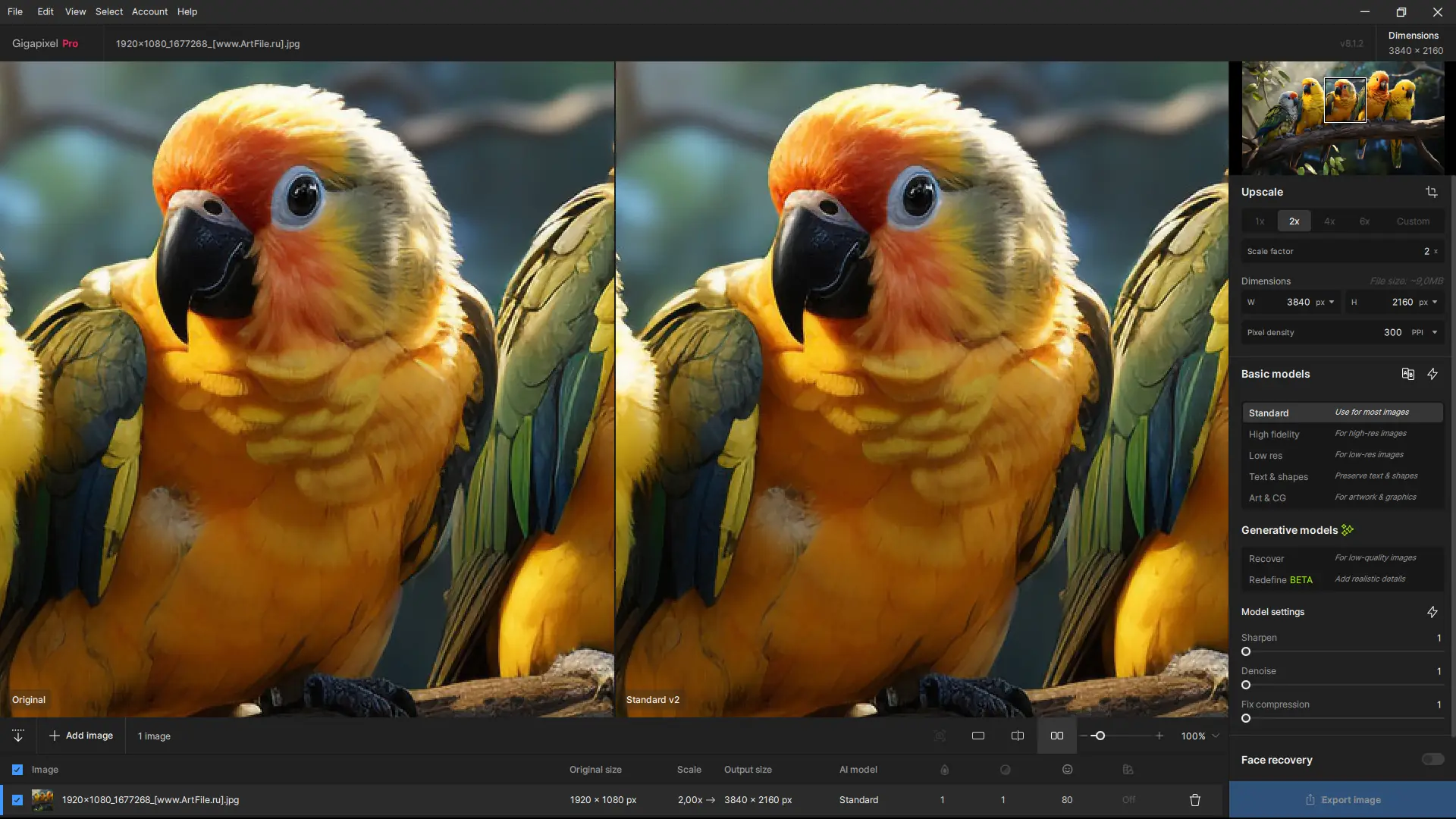 Интерфейс программы интуитивно понятен и ориентирован на быструю обработку. Пользователь загружает изображение, выбирает нужный коэффициент увеличения — от 2x до 6x — и активирует одну из специализированных моделей ИИ в зависимости от содержания снимка. Например, для портретов рекомендуется использовать режим Face Recovery AI, а для архитектуры — модель «Линии». После обработки можно сравнить оригинальное и увеличенное изображение в режиме реального времени и сохранить результат в популярных графических форматах. Поддержка пакетной обработки позволяет автоматизировать работу с несколькими файлами одновременно.
