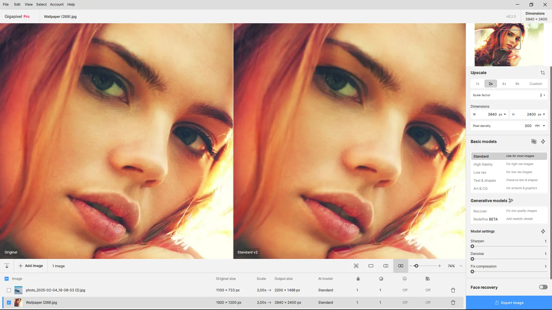 Интерфейс программы интуитивно понятен и не требует глубоких знаний в области обработки изображений. Пользователь загружает изображение, выбирает коэффициент увеличения и нужную модель обработки — например, для портретов, архитектуры или сжатых файлов. Далее алгоритм автоматически обрабатывает изображение, применяя соответствующие нейросетевые модели. После завершения процесса можно сравнить результат с оригиналом и при необходимости внести корректировки. Поддерживается пакетная обработка, что особенно удобно при работе с большим количеством файлов.