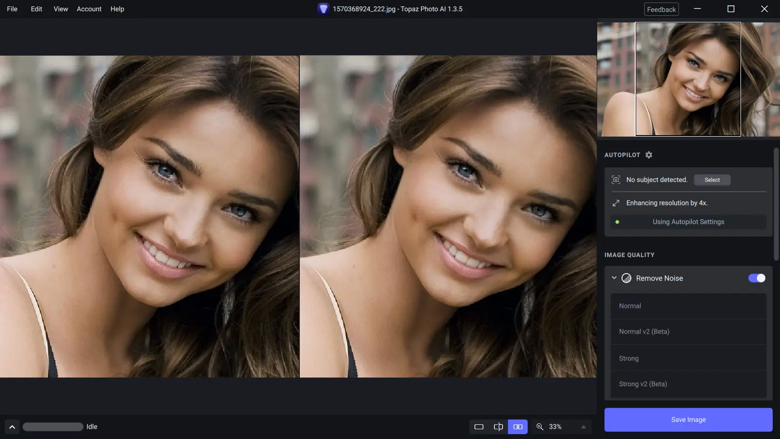 Интерфейс программы интуитивно понятен и ориентирован на быстрое выполнение задач. После загрузки изображения система автоматически проводит анализ, выявляя наличие шума, размытости или необходимости масштабирования. Пользователь может выбрать ручной режим настройки или довериться функции Autopilot, которая подберёт оптимальные параметры обработки. Каждый инструмент — шумоподавление, резкость и увеличение — работает независимо, но их комбинированное применение даёт наилучшие результаты. В режиме предварительного просмотра можно сравнить оригинал и обработанный фрагмент в реальном времени, что позволяет точно контролировать изменения. Поддерживаются как пакетная обработка, так и индивидуальная коррекция каждого снимка.