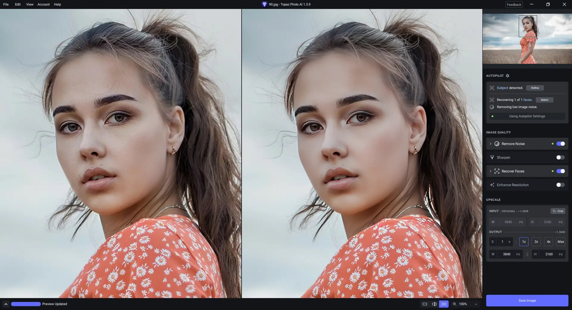 Пользоваться программой просто: достаточно загрузить изображение, после чего активируется функция Autopilot, анализирующая наличие шума, размытости или недостаточного разрешения. На основе анализа система предлагает автоматические корректировки, которые можно принять или изменить вручную. Каждый инструмент — шумоподавление, резкость, масштабирование — работает независимо, позволяя точно контролировать результат. Интерфейс интуитивно понятен, а предварительный просмотр в реальном времени помогает оценить изменения до применения.