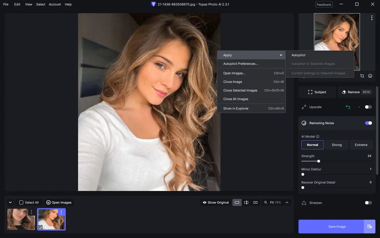 Использование программы начинается с загрузки изображения в интерфейс. После анализа система предлагает автоматические корректировки через режим Autopilot или позволяет вручную настроить уровень шумоподавления, резкости и масштабирования. Пользователь может просматривать изменения в режиме реального времени, переключаясь между оригиналом и обработанной версией. Программа также поддерживает пакетную обработку, что особенно полезно при работе с большим количеством снимков. Экспорт выполняется в выбранный формат с сохранением качества, а настройки можно сохранять в виде пресетов для повторного использования.
