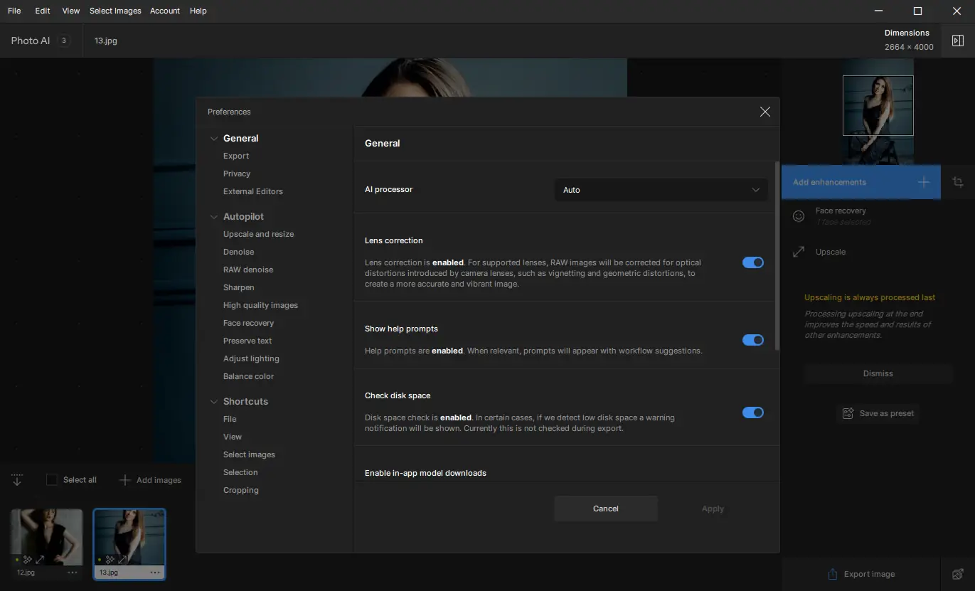 Использование программы начинается с загрузки изображения в интерфейс. После анализа система предлагает включить режим Autopilot, который автоматически применяет необходимые коррекции. Пользователь может вручную настраивать интенсивность шумоподавления, резкости и масштабирования, предварительно просматривая изменения в режиме реального времени.