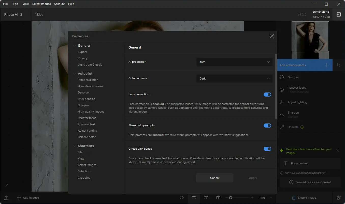 Интерфейс программы интуитивно понятен и ориентирован на быстрый запуск процесса редактирования. После загрузки изображения система автоматически проводит анализ и предлагает оптимальные настройки через функцию Autopilot. Пользователь может принять предложения или вручную регулировать интенсивность шумоподавления, резкости и масштабирования. Каждый параметр сопровождается предварительным просмотром, что позволяет визуально оценить изменения до применения. Поддерживаются популярные форматы изображений, включая RAW, что делает инструмент универсальным для различных рабочих процессов.