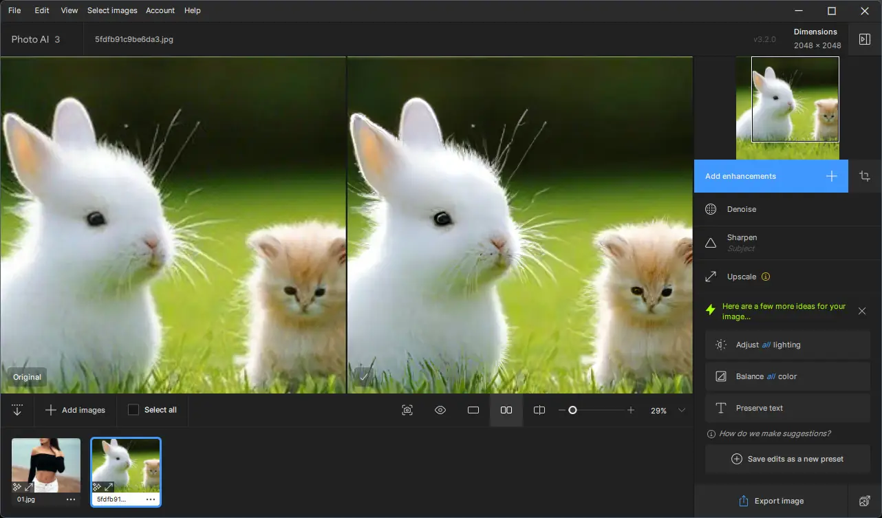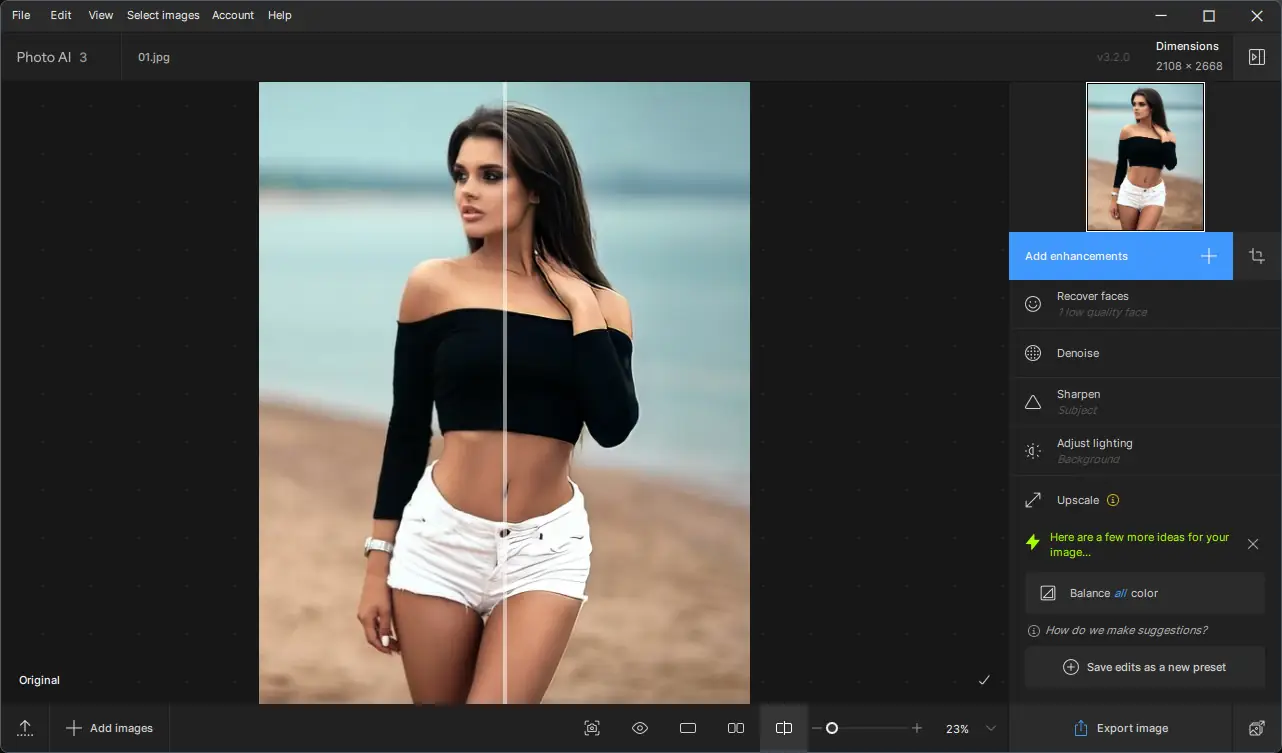 Программа демонстрирует высокую эффективность при обработке сложных снимков, где традиционные методы дают ограниченный результат. Алгоритмы ИИ способны восстанавливать мелкие детали, которые невозможно улучшить стандартными фильтрами. При этом сохраняется естественная текстура кожи, структура тканей и другие нюансы, что особенно важно для портретной и репортажной фотографии. Однако, как и любое ПО на базе нейросетей, оно требует определённых ресурсов системы.