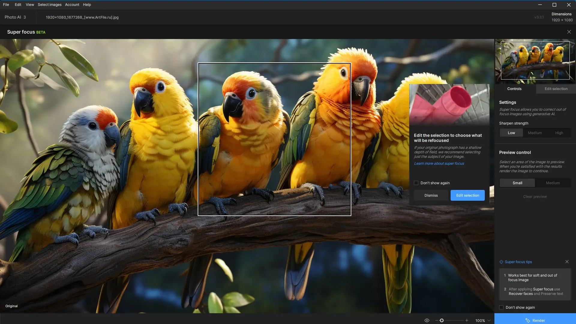 Программа использует обученные модели ИИ, чтобы распознавать текстуры, края и шум, обеспечивая естественный вид изображения после обработки.