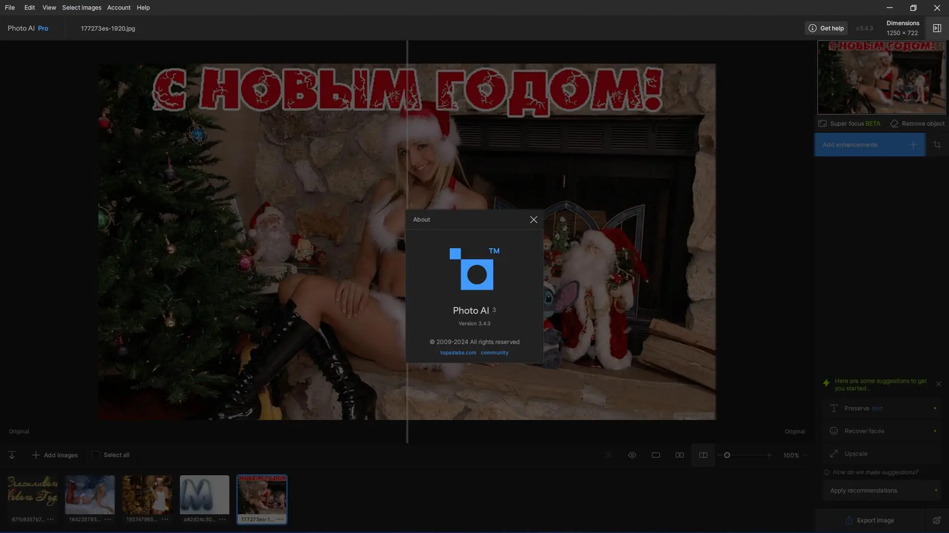 Topaz Photo AI — это программное обеспечение для автоматической обработки фотографий с использованием технологий искусственного интеллекта. Приложение объединяет функции устранения шума, повышения резкости и увеличения изображений без потери качества. Программа подходит как для любителей, так и для профессионалов, стремящихся улучшить визуальную чёткость снимков с минимальными усилиями. Благодаря продуманному интерфейсу и мощным алгоритмам, редактирование становится быстрым и эффективным процессом. Инструмент анализирует каждое изображение, выявляя недостатки и применяя оптимальные корректировки.