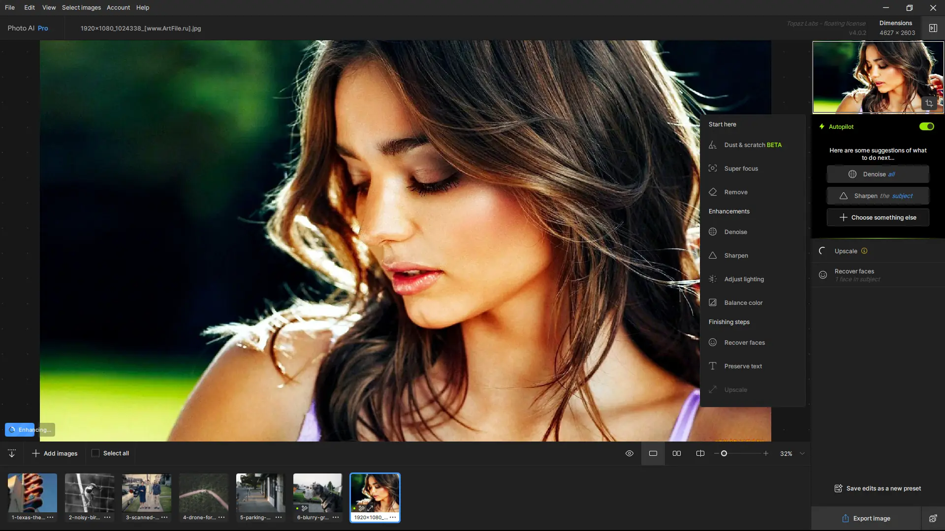 Интерфейс приложения интуитивно понятен и ориентирован на скорость работы. После загрузки изображения программа автоматически начинает анализ, выявляя типичные дефекты — шум, размытие, недостаточную детализацию. Пользователь может выбрать режим Autopilot для мгновенного исправления или переключиться в ручной режим, где доступны слайдеры для точной регулировки каждого параметра. Работа ведётся в реальном времени с возможностью предпросмотра изменений по частям изображения. Поддерживаются популярные форматы, включая RAW, что особенно важно для профессиональных фотографов. Результат можно экспортировать напрямую в другие редакторы или сохранить в нужном формате на устройство.
