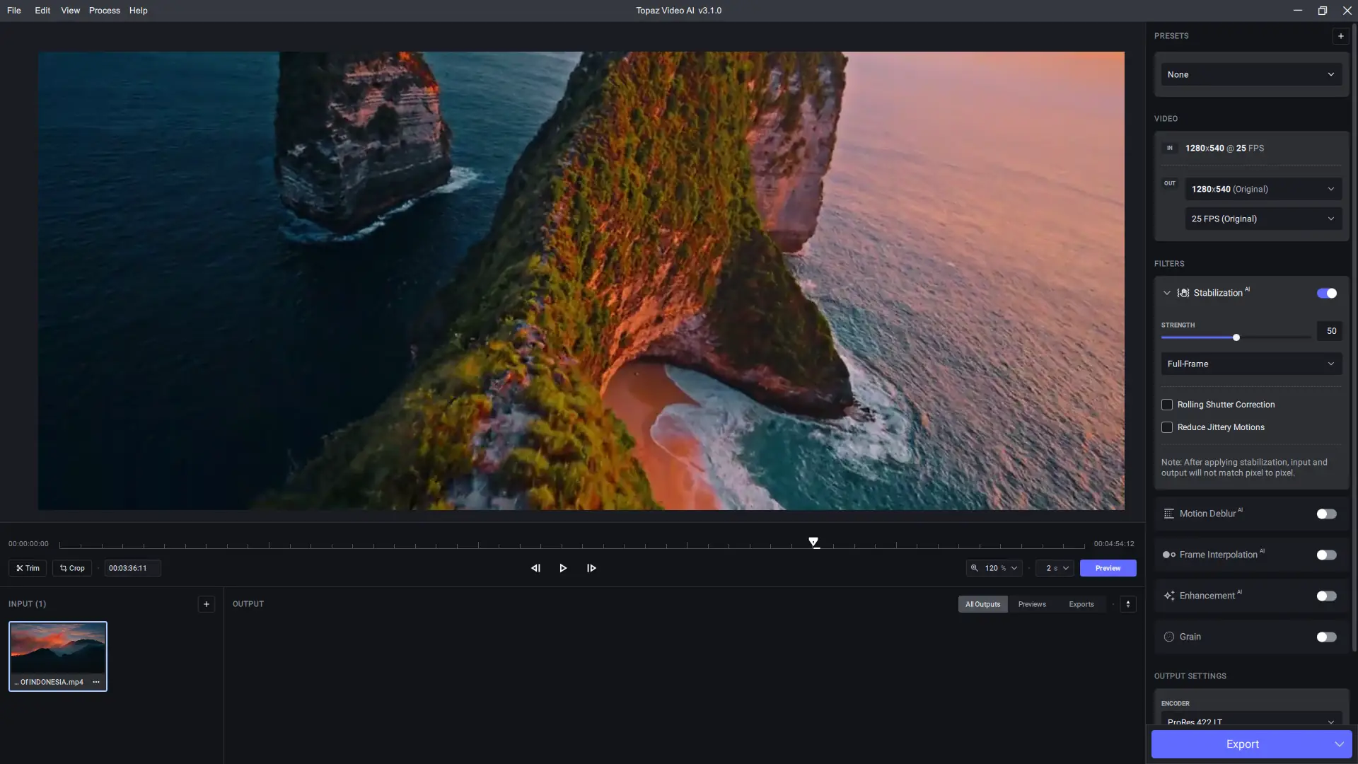 Работа с программой начинается с загрузки исходного видеофайла в интерфейс. Далее пользователь выбирает модель обработки в зависимости от типа контента — например, для сглаживания размытых движений используется модель Themis, а для стабилизации подойдут Chronos или Full Frame Stabilization. Настройки масштабирования, шумоподавления и зернистости регулируются с помощью ползунков, позволяя точно контролировать результат. После настройки параметров запускается рендеринг, который может выполняться быстрее на системах с видеокартами NVIDIA благодаря поддержке TensorRT. Готовое видео экспортируется в указанную папку с промежуточными файлами, что упрощает отслеживание процесса.