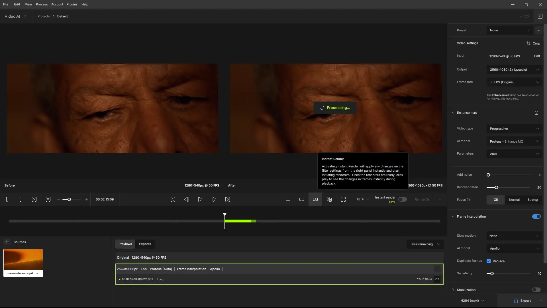 Работа с программой начинается с импорта видеофайла в интерфейс. Далее пользователь выбирает нужный режим обработки — увеличение разрешения, стабилизация, улучшение чёткости или подавление шумов. После настройки параметров, таких как целевое разрешение и модель ИИ, запускается процесс рендеринга. Готовое видео экспортируется в выбранный формат с высокой степенью сохранения качества.