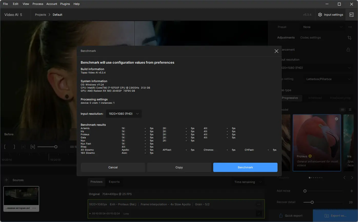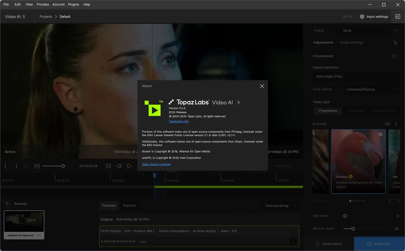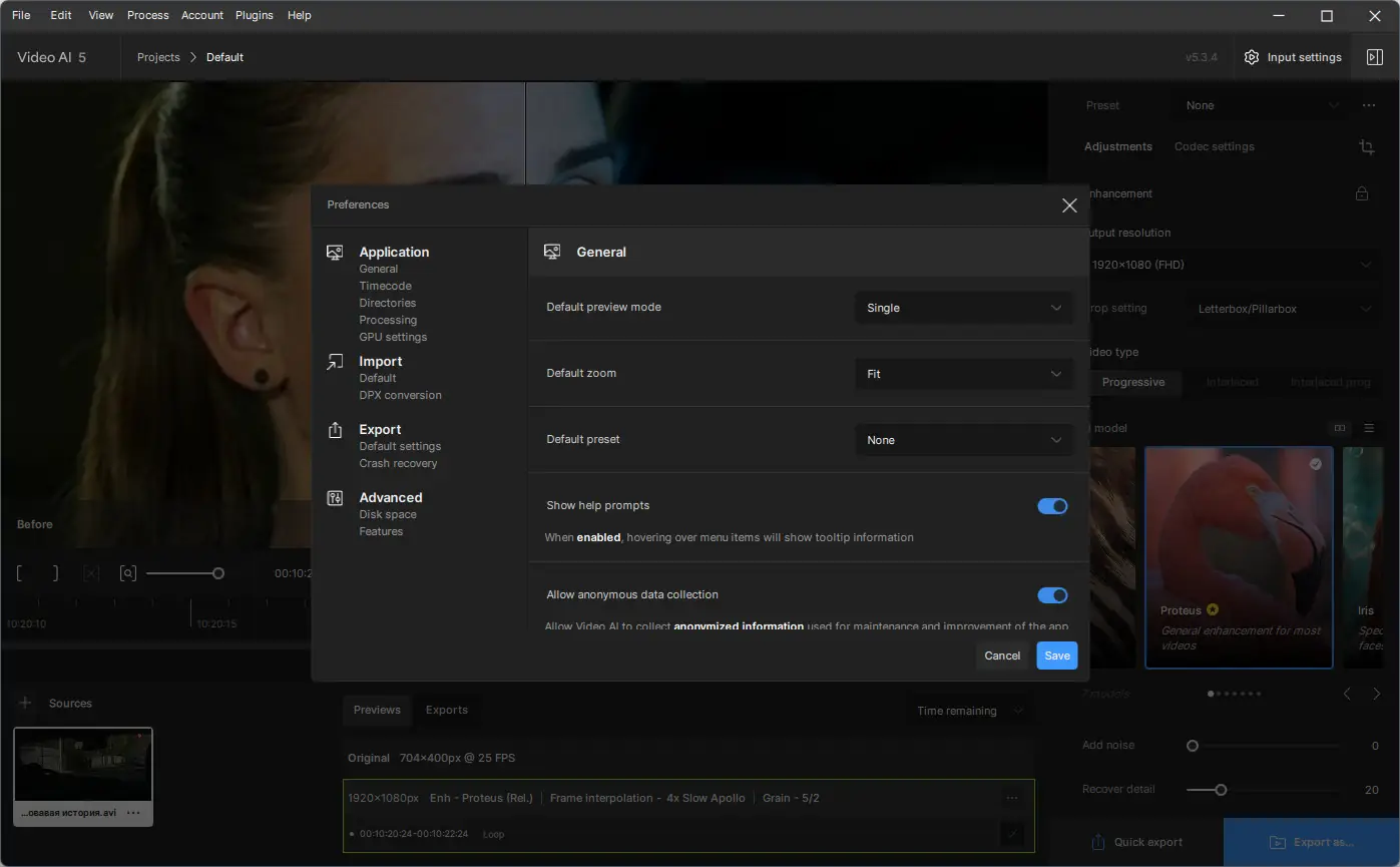 Интерфейс Topaz Video AI интуитивно понятен и не требует глубоких технических знаний. После загрузки видеофайла пользователь выбирает нужную модель обработки, задаёт параметры масштабирования и настраивает выходное разрешение. Процесс рендеринга запускается в несколько кликов, а статус выполнения отображается в реальном времени. Поддерживается работа с различными форматами, включая MP4, AVI, MOV и другие распространённые контейнеры. Программа эффективно использует ресурсы видеокарты, ускоряя обработку за счёт GPU.