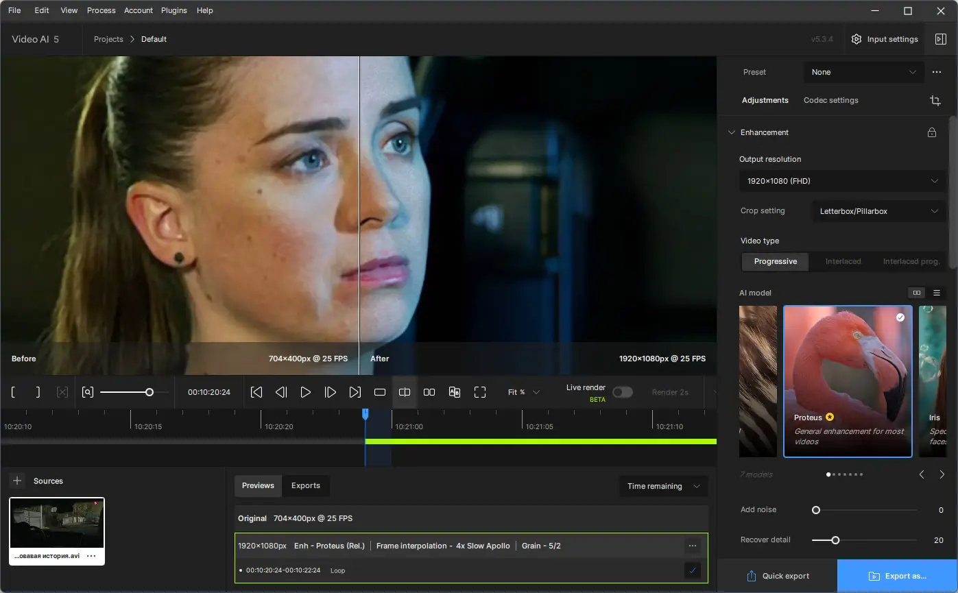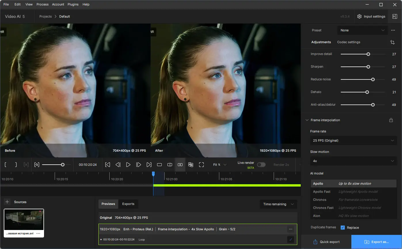 Программа демонстрирует высокую эффективность при работе с материалами различного происхождения. Её ключевое преимущество — способность воссоздавать детали, которые физически отсутствовали в исходном видео, за счёт логического прогнозирования. При этом сохраняется естественность изображения, а шум и размытость подавляются на уровне алгоритмов. Однако из-за интенсивных вычислений обработка может занимать значительное время, особенно при работе с длинными роликами и высокими разрешениями.