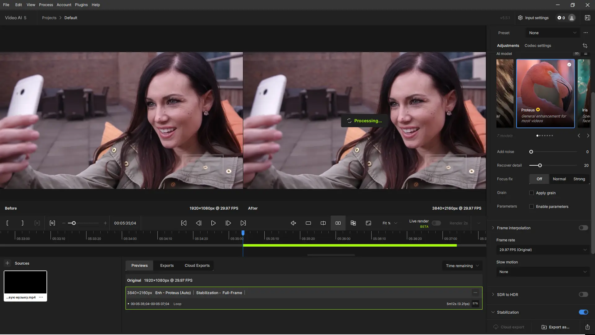 Работа с программой начинается с импорта видеоролика в рабочую область. Пользователь выбирает нужный режим обработки — увеличение разрешения, устранение шумов, коррекция размытости или стабилизация кадра. Далее задаются параметры вывода: целевое разрешение, частота кадров и используемая модель искусственного интеллекта. После настройки запускается процесс рендеринга, который может занять некоторое время в зависимости от длины видео и мощности системы. Готовый файл сохраняется в выбранном формате, готовый к публикации или дальнейшему монтажу. Интерфейс минималистичен, но функционален, что упрощает как базовую, так и продвинутую настройку.