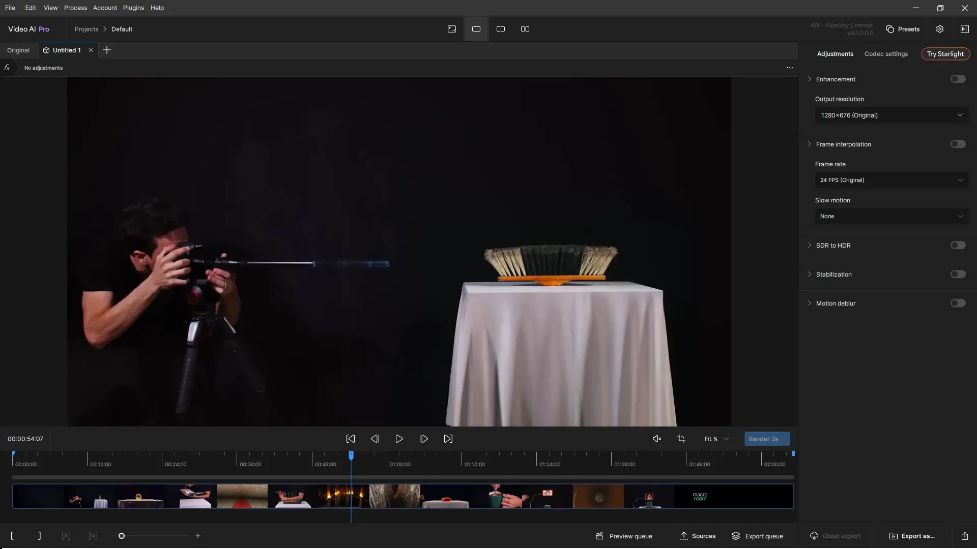 Работа с программой начинается с импорта видеофайла через панель источников, расположенную под временной шкалой. Пользователь выбирает нужный участок для обработки, применяет модель улучшения — например, увеличение, стабилизацию или шумоподавление — и настраивает параметры через вкладки. Каждая вкладка представляет собой отдельный набор настроек, что позволяет быстро переключаться между вариантами и сравнивать результаты в режиме «Разделенный экран» или «Рядом». Живой рендеринг позволяет просматривать изменения в реальном времени, а обновлённая очередь экспорта отслеживает процесс конвертации с подробной информацией о каждом файле. После завершения настройки видео экспортируется в выбранном формате с поддержкой высокого битрейта и HDR.