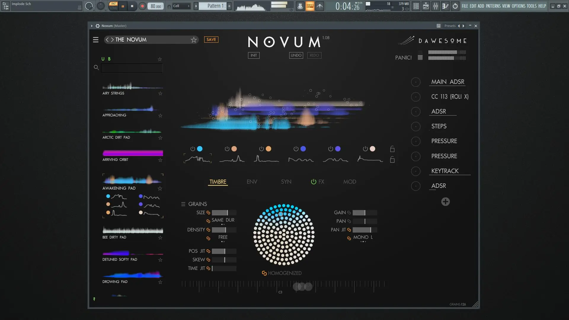 - Timbre flower позволяет спектрально изменять тембры, визуально и точно настраивая соотношение частотных компонентов в звуке.