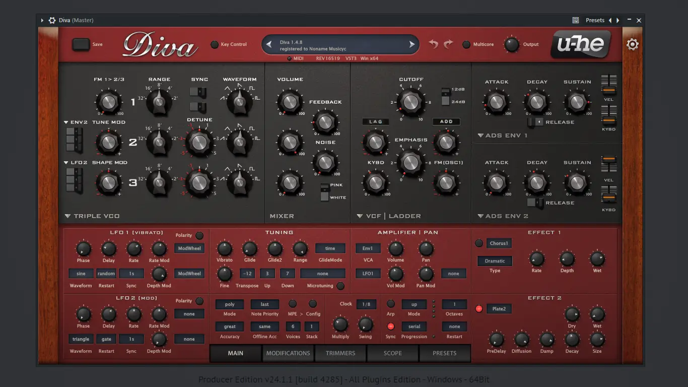 u-he — Diva — это виртуальный аналоговый синтезатор, разработанный для воссоздания аутентичного звучания классических синтезаторов прошлого. Программа объединяет точное моделирование генераторов, фильтров и огибающих легендарных аппаратов, предлагая музыкантам и продюсерам широкие возможности для создания насыщенных тембров. С её помощью можно как имитировать звучание конкретных винтажных моделей, так и экспериментировать с гибридными архитектурами.