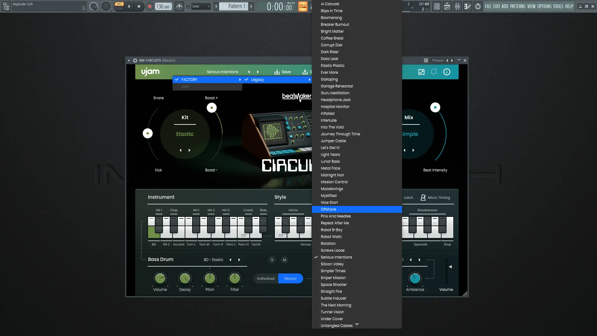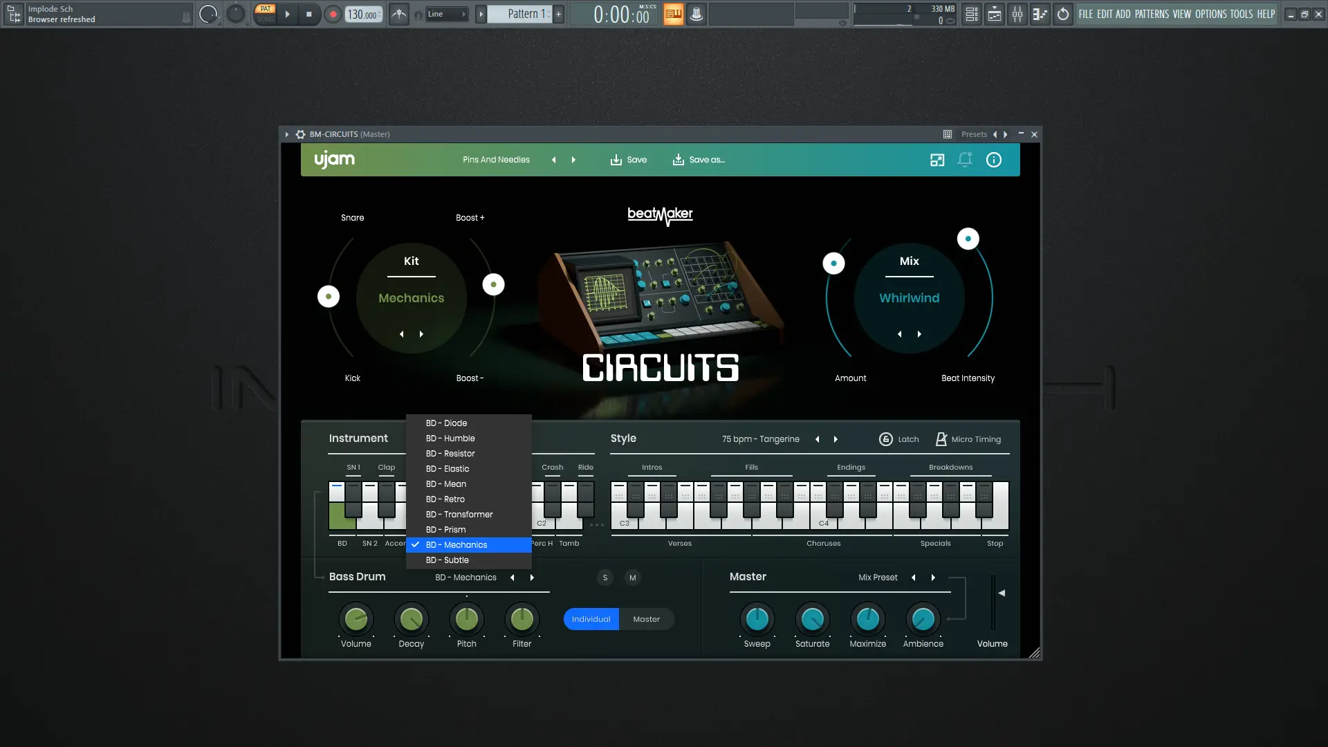 Программа интегрируется в DAW как стандартный VST-инструмент. После загрузки можно выбрать один из десяти барабанных наборов и подобрать подходящий стиль ритма. Готовые паттерны легко вставляются в проект, а параметры микширования позволяют регулировать басы, стереобазу, задержку и эквализацию в реальном времени. Для более глубокой настройки доступны дополнительные эффекты, включая слэп-дилей и фильтры. CIRCUITS также поддерживает синхронизацию с темпом проекта, что упрощает создание согласованных композиций.