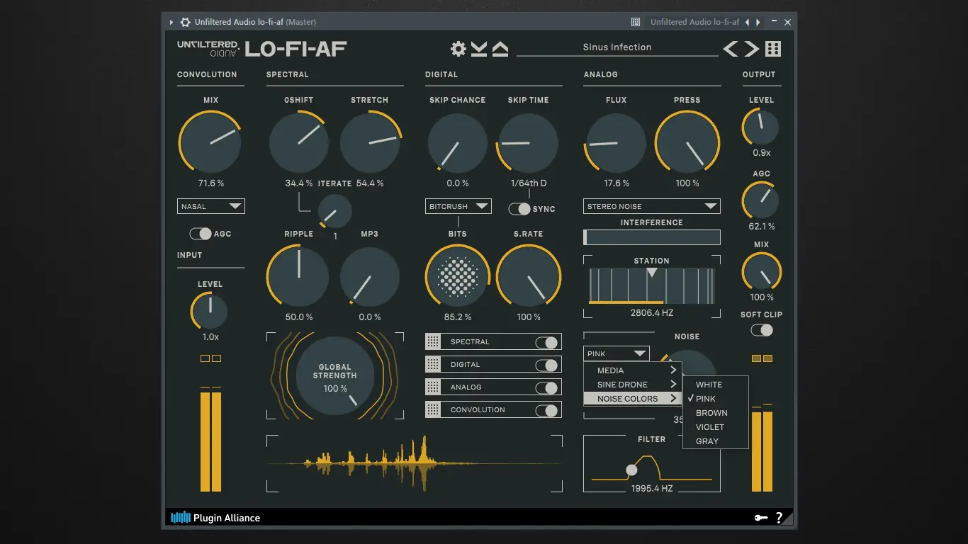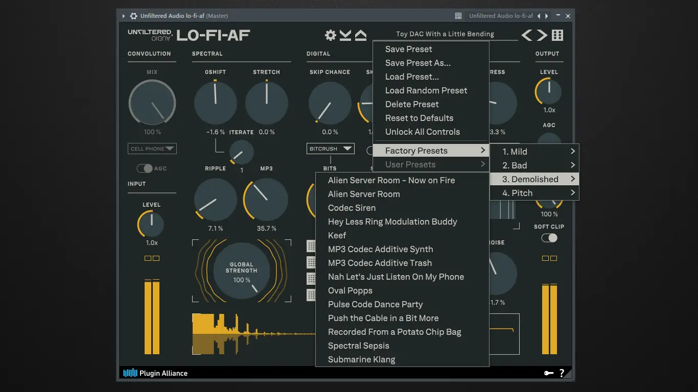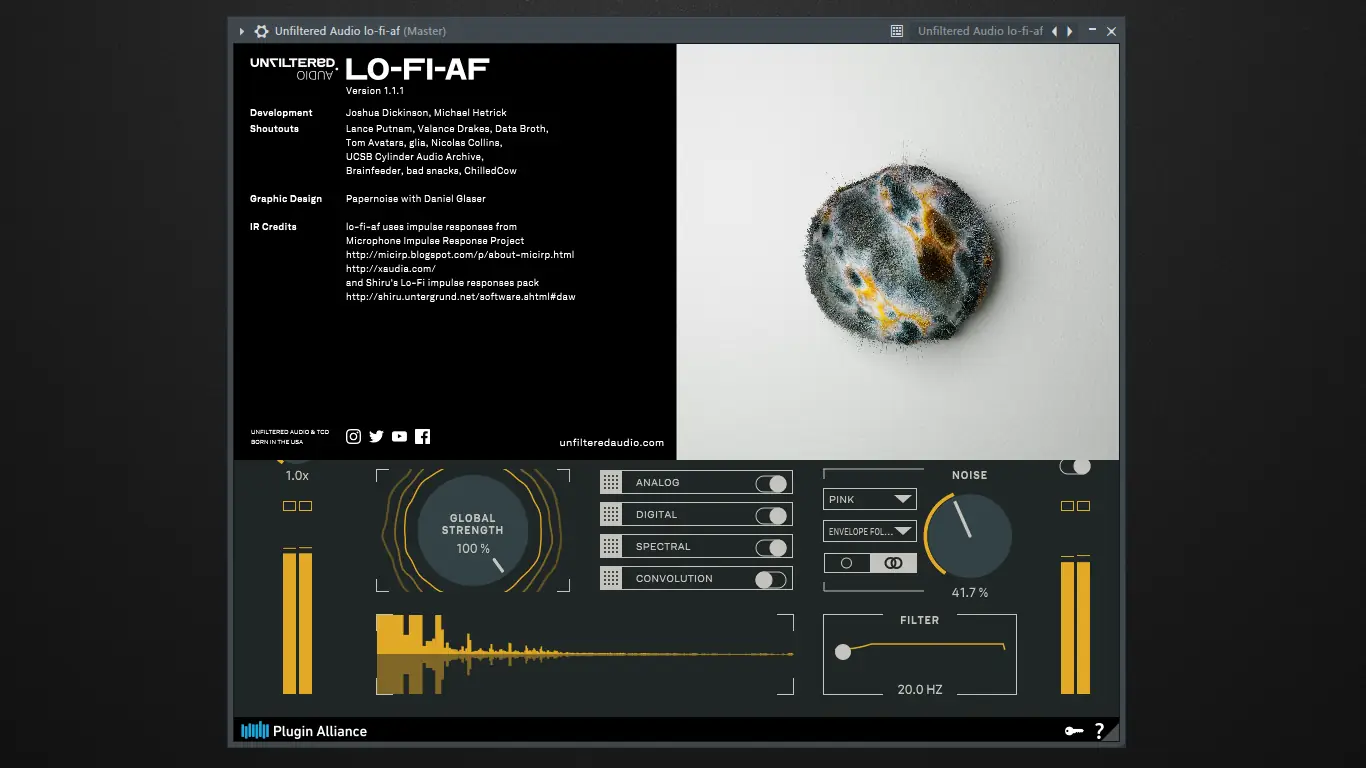 Unfiltered Audio LO-FI-AF предлагает продвинутый подход к созданию лоу-фай звучания, выходя далеко за рамки простого биткрашинга. Плагин использует импульсные характеристики, моделирование спектра и другие алгоритмы для точного воссоздания артефактов, присущих устаревшим носителям. От треска винила до пропусков на CD и артефактов сжатия MP3 — всё это доступно в одном инструменте.