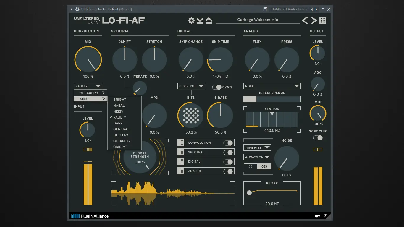 Unfiltered Audio LO-FI-AF — это уникальный аудиоплагин, воссоздающий характерные артефакты аналоговых и цифровых носителей прошлого. С его помощью можно имитировать звучание винила, кассет, компакт-дисков, MP3 и даже мобильной связи. Программа сочетает в себе технологии свертки, спектрального формирования и цифровой деградации для достижения аутентичного лоу-фай эффекта.