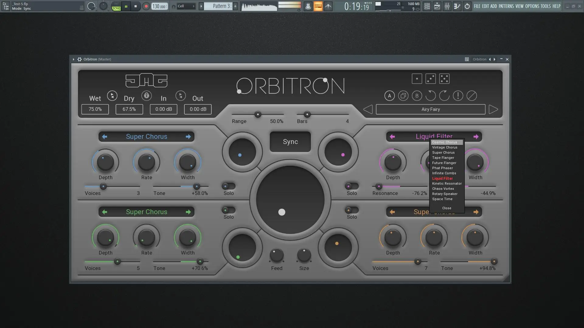 Orbitron представляет собой уникальный подход к обработке звука, где классические эффекты модуляции переосмысливаются через призму многомерного взаимодействия. Вместо использования одного эффекта за раз, пользователь получает возможность комбинировать четыре независимых секции, каждая из которых может быть настроена на один из двенадцати режимов — от хоруса и фленжера до фейзера и специализированных фильтров. Центральный элемент интерфейса — вращающийся круг, визуально отображающий переход между эффектами и позволяющий точно контролировать баланс.