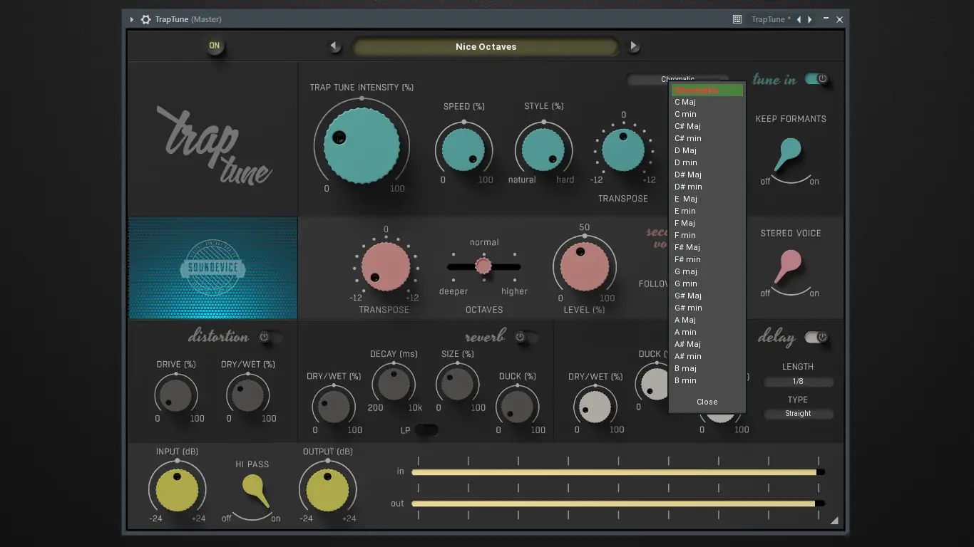 TrapTune — это мощный вокальный плагин, сочетающий тюнер, гармонизатор, дублер, искажение и эффекты пространства для создания выразительных и современных вокальных дорожек. Подходит как для тонкой коррекции, так и для создания ярких, стилизованных звуков в жанрах хип-хоп, трэп, поп и EDM.