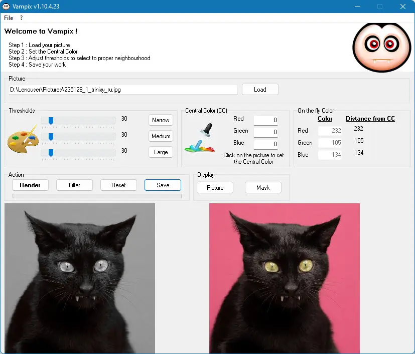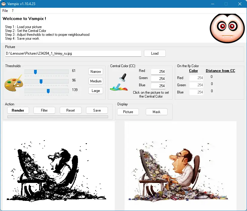 Vampix — это компактная и интуитивно понятная утилита для преобразования цветовой гаммы изображений, позволяющая быстро применять монохромные эффекты, корректировать оттенки и экспериментировать с визуальным восприятием графики. Программа подходит как новичкам, так и опытным пользователям, желающим оперативно изменить внешний вид фотографий без сложных настроек. Интерфейс ориентирован на максимальную простоту и скорость работы.